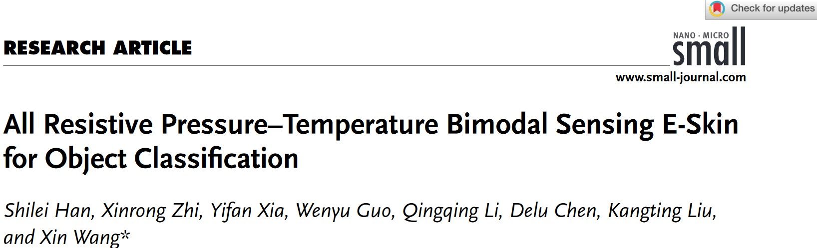 该研究成果以All Resistive Pressure–Temperature Bimodal Sensing E-Skin for Object Classification为题,在Small上发表。yl7703永利官网为独立完成单位,已毕业硕士研究生韩石磊为第一作者,王新教授为论文通讯作者。