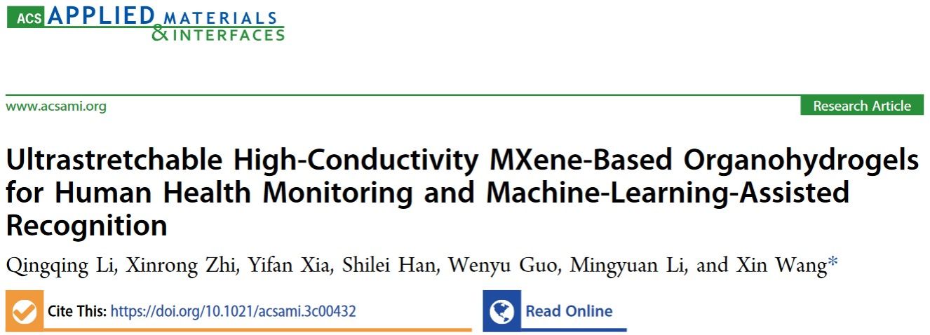 该研究成果以Ultrastretchable High-Conductivity MXene-Based Organohydrogels for Human Health Monitoring and Machine-Learning-Assisted Recognition为题,在ACS Applied Materials & Interfaces上发表。yl7703永利官网为独立完成单位,已毕业硕士研究生李晴晴为第一作者,王新教授为论文通讯作者。