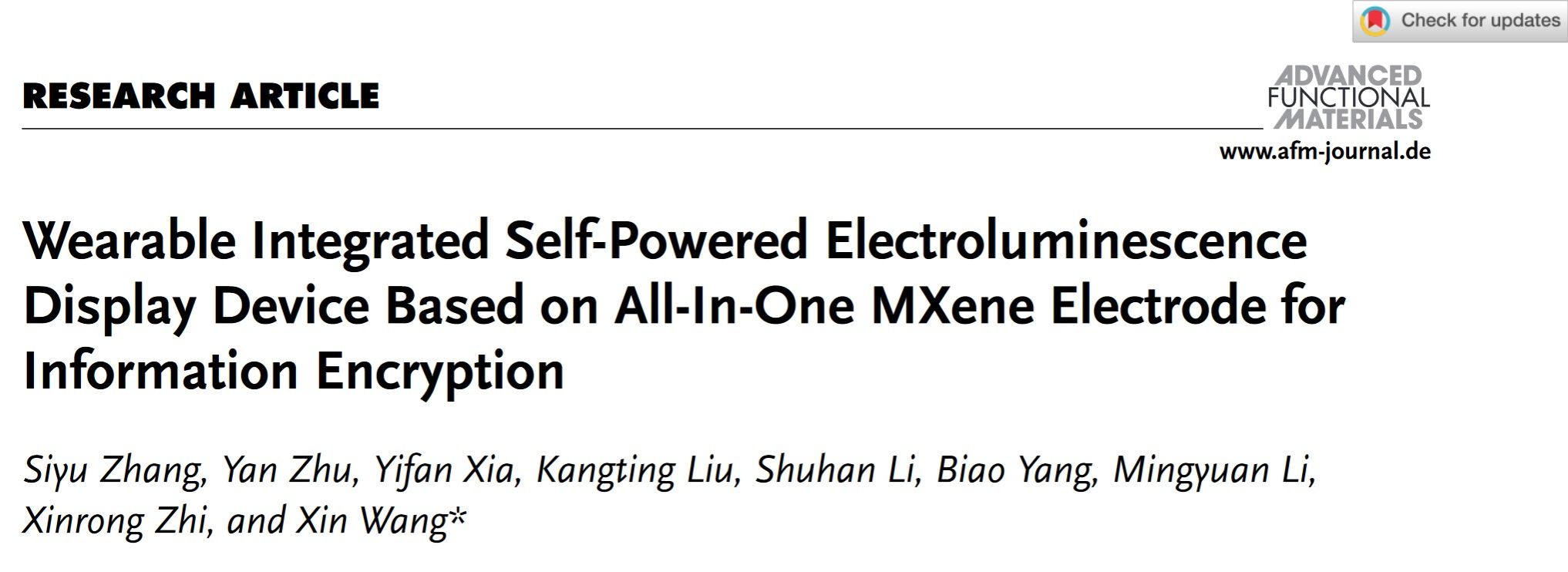 该研究成果以Wearable Integrated Self-Powered Electroluminescence Display Device Based on All-In-One MXene Electrode for Information Encryption为题,在Advanced Functional Materials上发表。yl7703永利官网为独立完成单位,在读硕士研究生张思语为第一作者,王新教授为论文通讯作者。