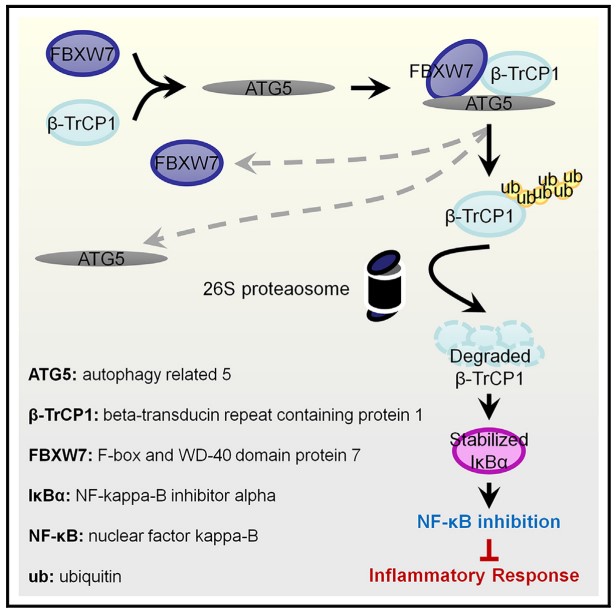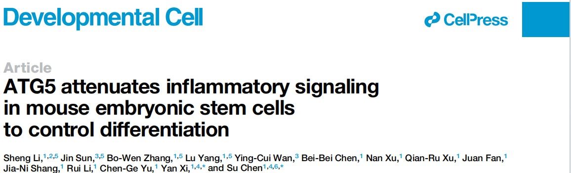 近日,yl7703永利官网基础医学院陈苏教授课题组与山东第一医科大学科创中心孙锦教授课题组合作在Developmental Cell杂志在线发表了题为“ATG5 attenuates inflammatory signaling in mouse embryonic stem cells to control differentiation”的文章。该研究揭示了自噬相关蛋白ATG5通过非自噬途径抑制NF-κB炎症信号通路的分子机制,发现了一条全新的ATG5-β-TrCP1-NF-κB炎症相关信号通路,且ATG5-β-TrCP1影响了小鼠胚胎干细胞(mESCs)炎症反应以及分化。