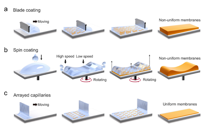 离子选择性膜在众多体系中具有广泛应用,例如燃料电池的质子交换膜、液流电池隔膜、海水淡化等。如何实现离子选择性膜的高通量离子传输是实现能源转换器件高能量效率和高库仑效率的关键。目前,离子选择性膜主要通过喷涂法、滴涂法、刮涂法、旋涂法等方法制备(图1)。然而,这些技术难以精准控制微升级聚合物溶液在基底上的均匀铺展,以及聚合物液膜中溶剂的均匀挥发,导致了制备的聚合物膜厚(微米尺度)且不均匀,限制了其离子选择性和通量,成为离子选择性膜应用的瓶颈。