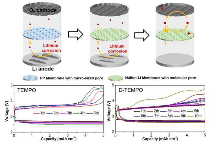 图2.液相催化剂D-TEMPO和亚微米级厚度聚合物离子传输膜的双重调控策略提升锂氧气电池循环稳定性(循环容量5 mAh cm-2)。