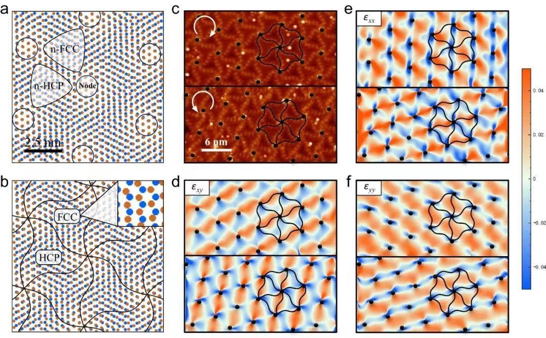 该研究团队在Cu(111)上生长了高质量大面积手性BlueP单层膜,其横向尺寸仅受晶圆尺寸大小限制。研究发现BlueP具有超平坦蜂窝晶格特征,而不是已被认知的屈曲结构(图1)。此外,由于衬底作用导致的旋转堆叠和界面应变释放效应,形成了高度有序的手性超结构,并进一步通过几何相位分析得到证实(图2)。扫描隧道谱显示了其本征的金属性和镜像势态中的不同特征量子振荡。他们还实现了超平坦BlueP的手性和非手性相之间的可逆转变,揭示了磷烯结构在Cu(111)上的独特生长模式。该研究工作将推动蓝磷烯在未来信息光学、自旋电子学和手性催化等方面的应用。