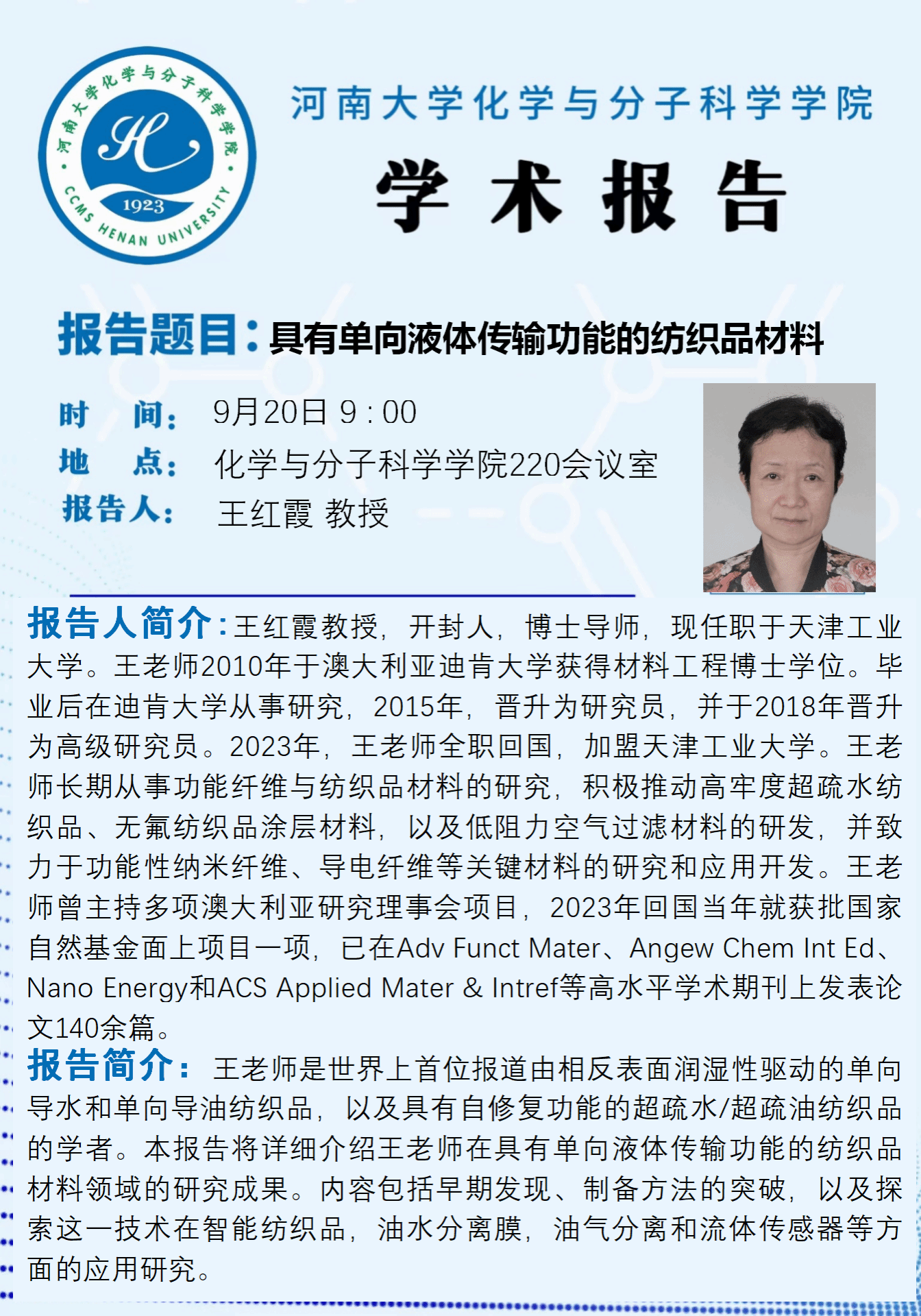 王红霞:具有单向液体传输功能的纺织品材料(时间:9月20日)