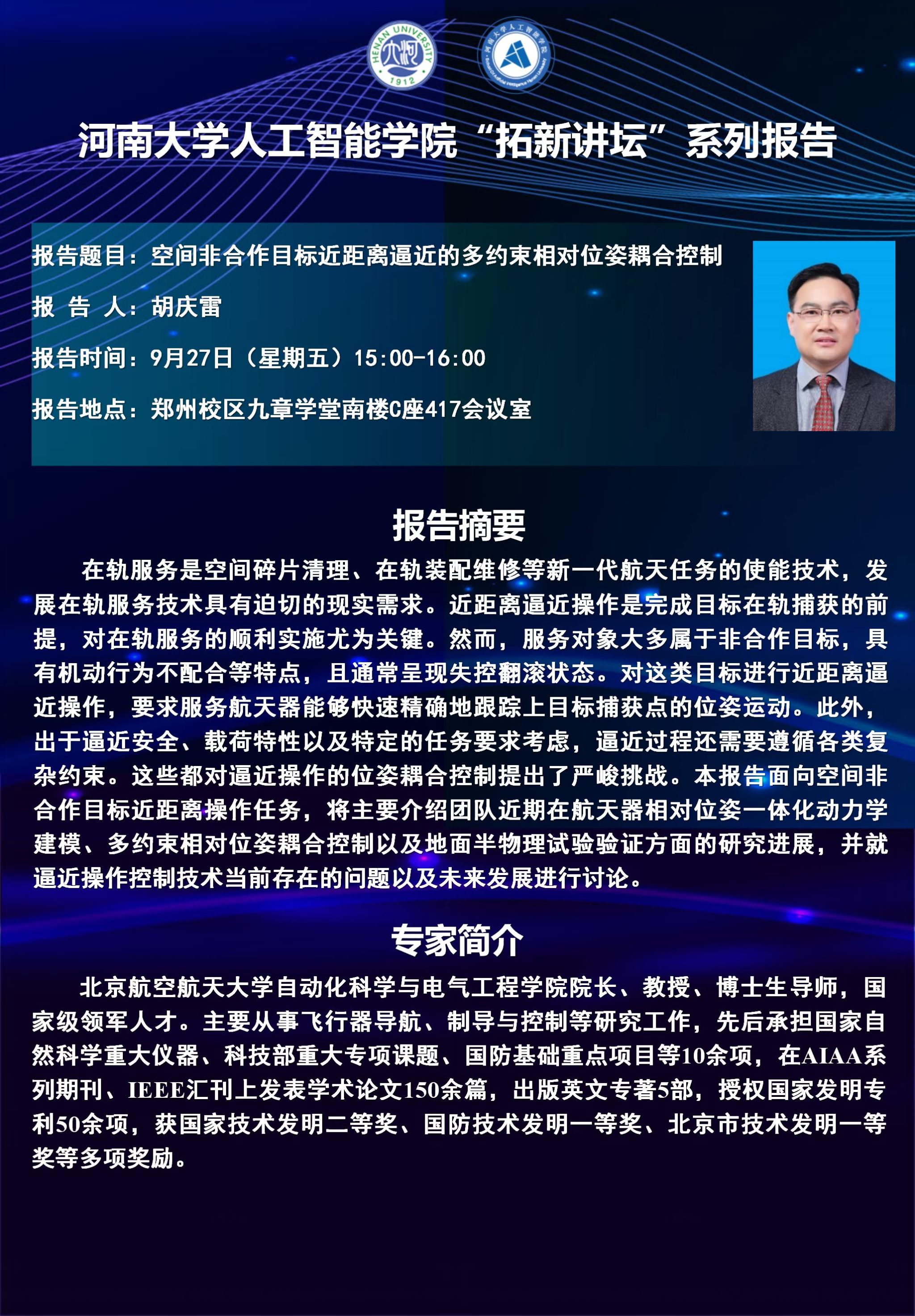 胡庆雷:空间非合作目标近距离逼近的多约束相对位姿耦合控制(时间:9月27日)