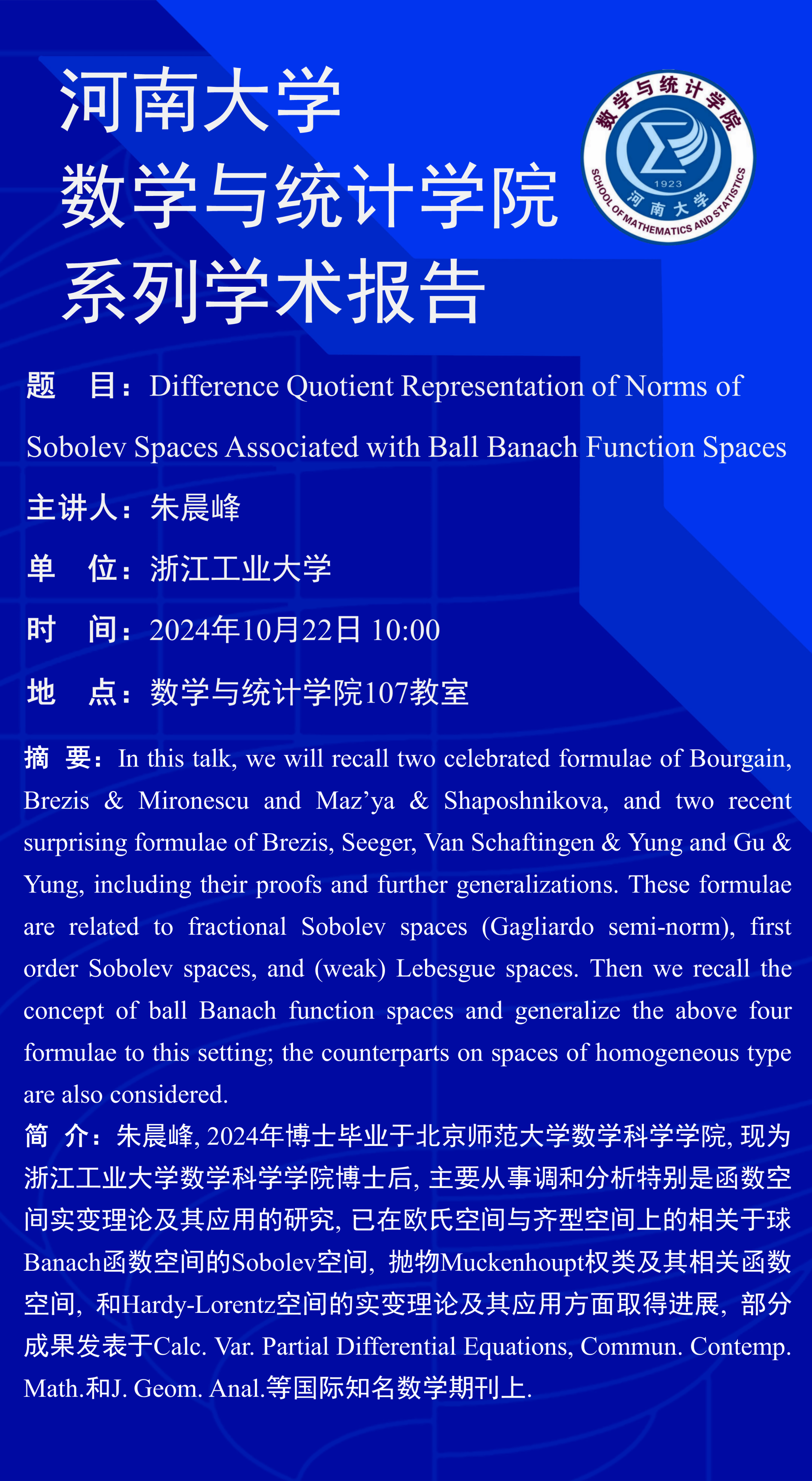 朱晨峰:Difference Quotient Representation of Norms of Sobolev Spaces Associated with Ball Banach Function Spaces(时间:10月22日)