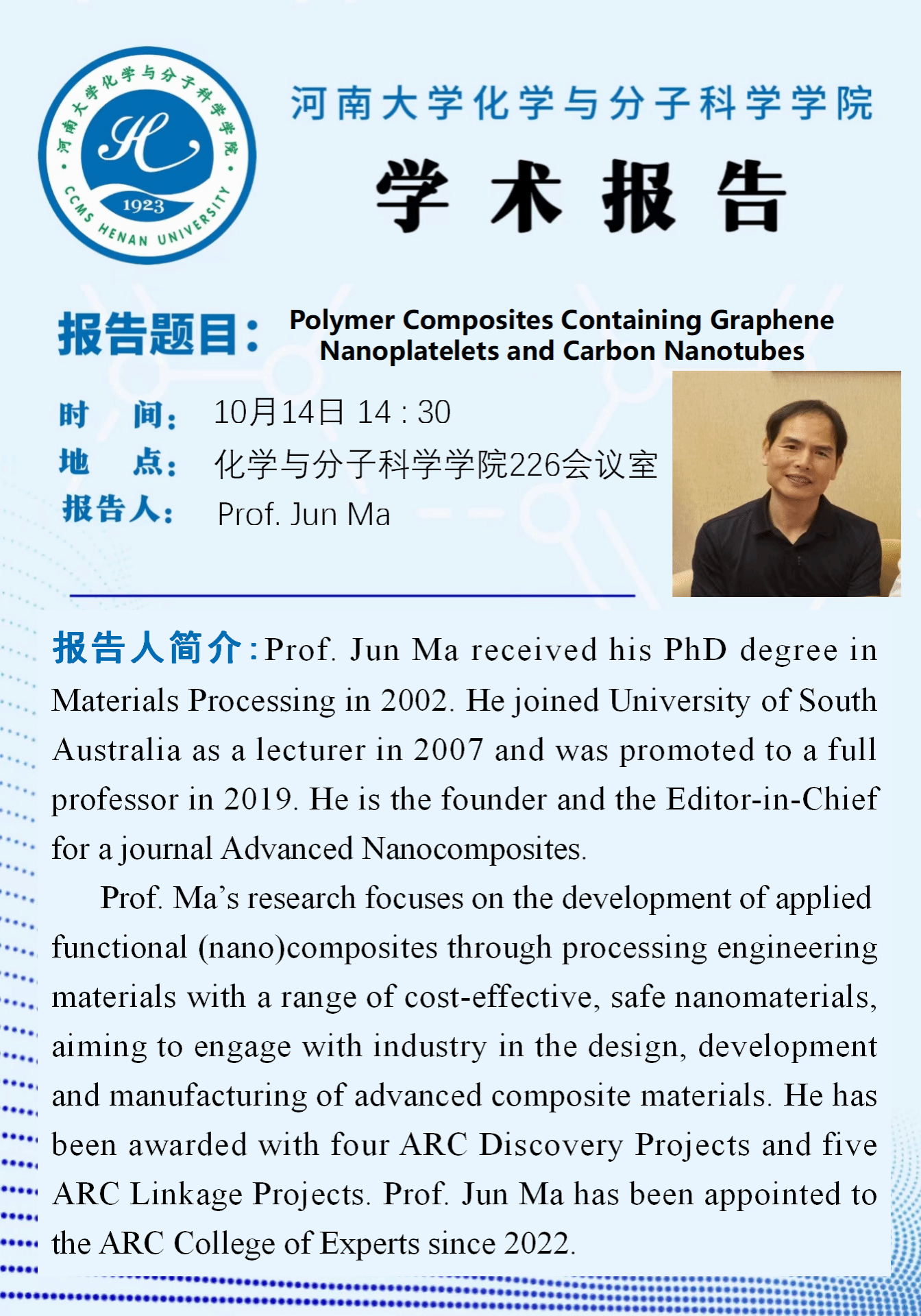 Jun Ma:Polymer Composites Containing Graphene Nanoplatelets and Carbon Nanotubes(时间:10月14日)