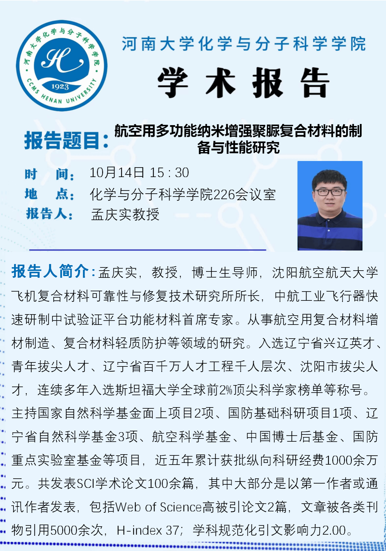 孟庆实:航空用多功能纳米增强聚脲复合材料的制备与性能研究(时间:10月14日)
