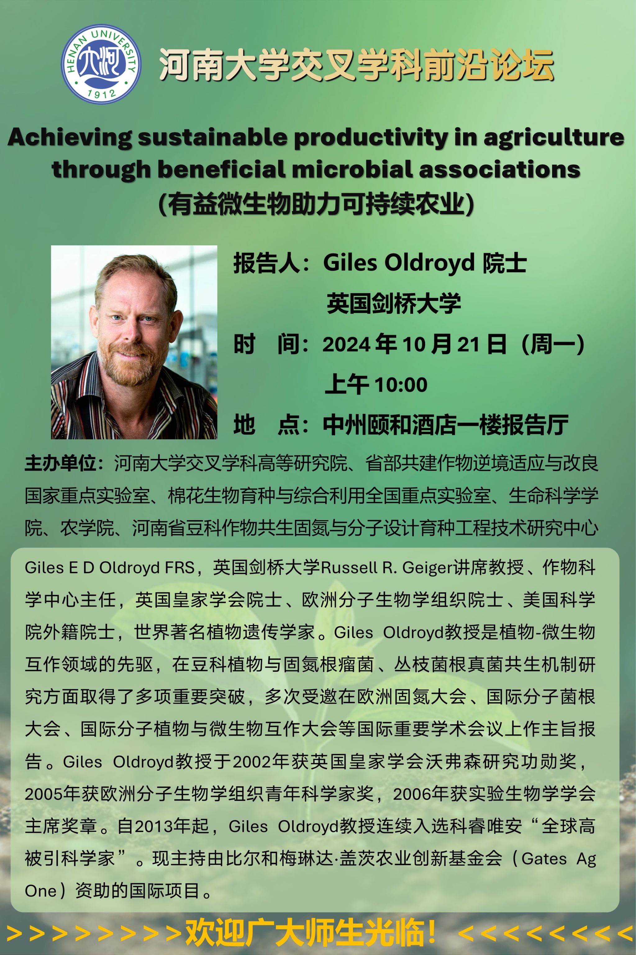 Giles Oldroyd:Achieving sustainable productivity in agriculture through beneficial microbial associations (有益微生物助力可持续农业)(时间:10月21日)
