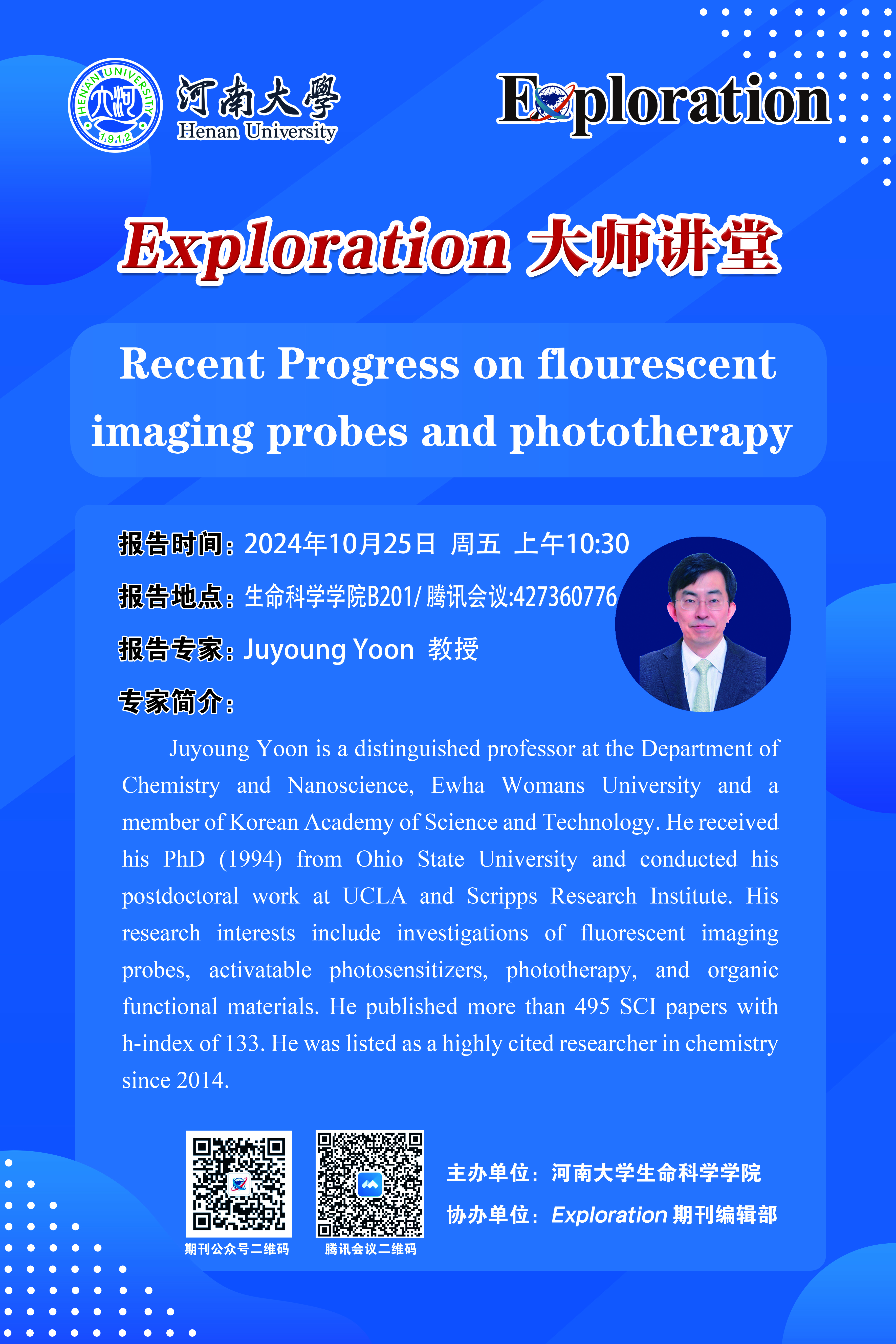 Juyoung Yoon:Recent Progress on flourescent imaging probesand phototherapy(时间:10月25日)