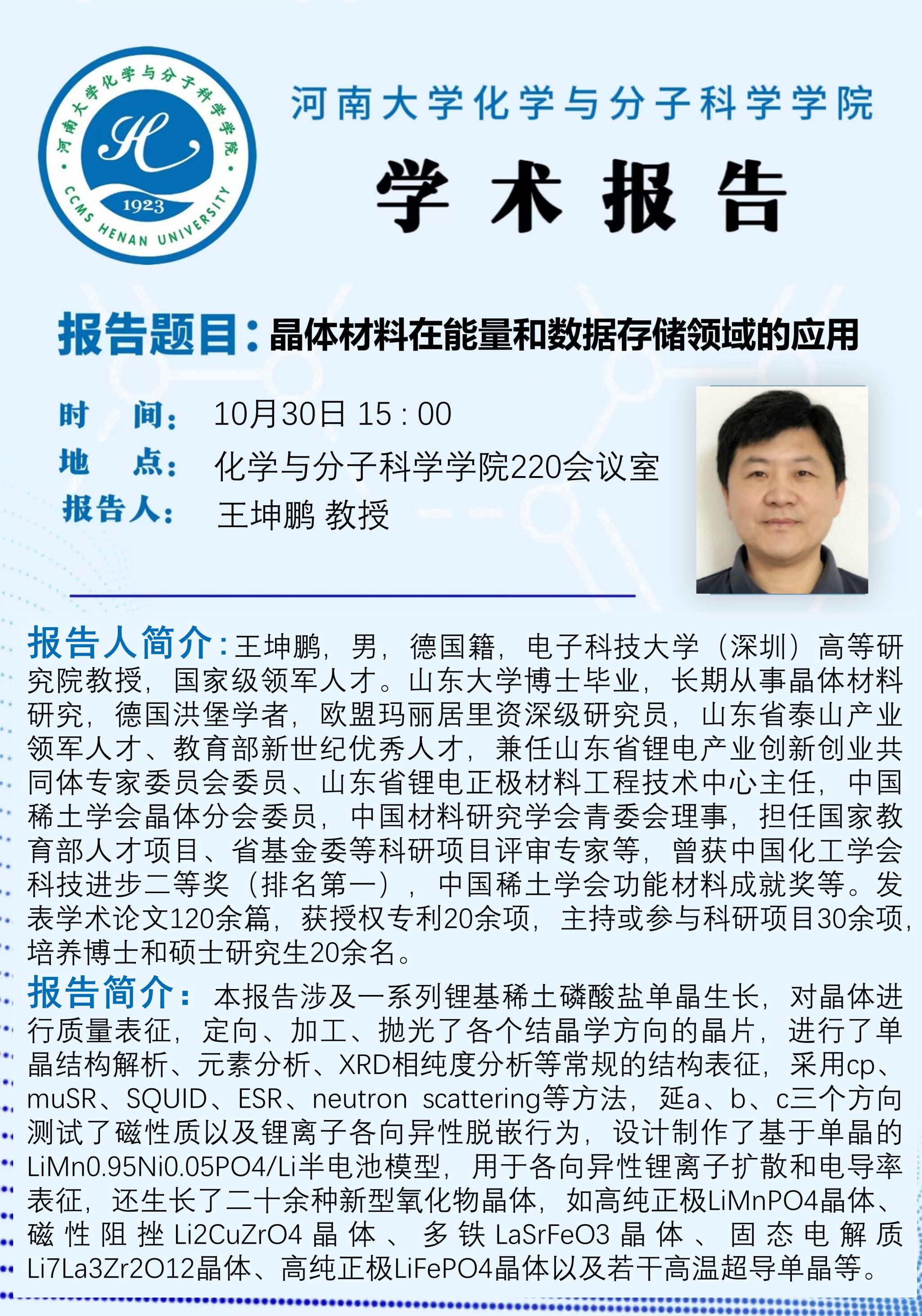王坤鹏:晶体材料在能量和数据存储领域的应用(时间:10月30日)