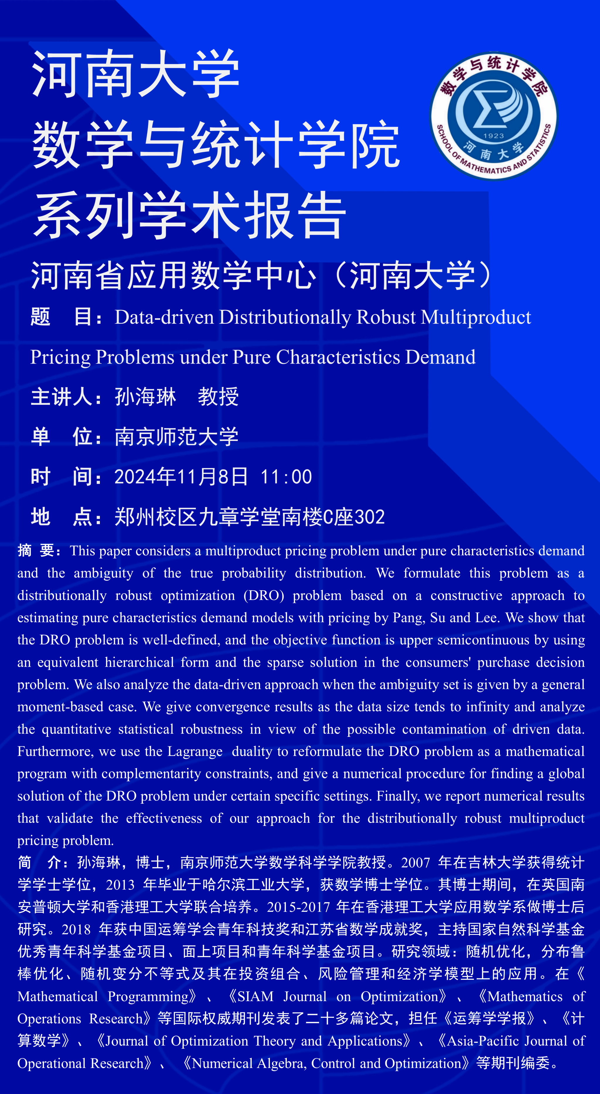 孙海琳:Data-driven Distributionally Robust Multiproduct Pricing Problems under Pure Characteristics Demand(时间:11月8日)