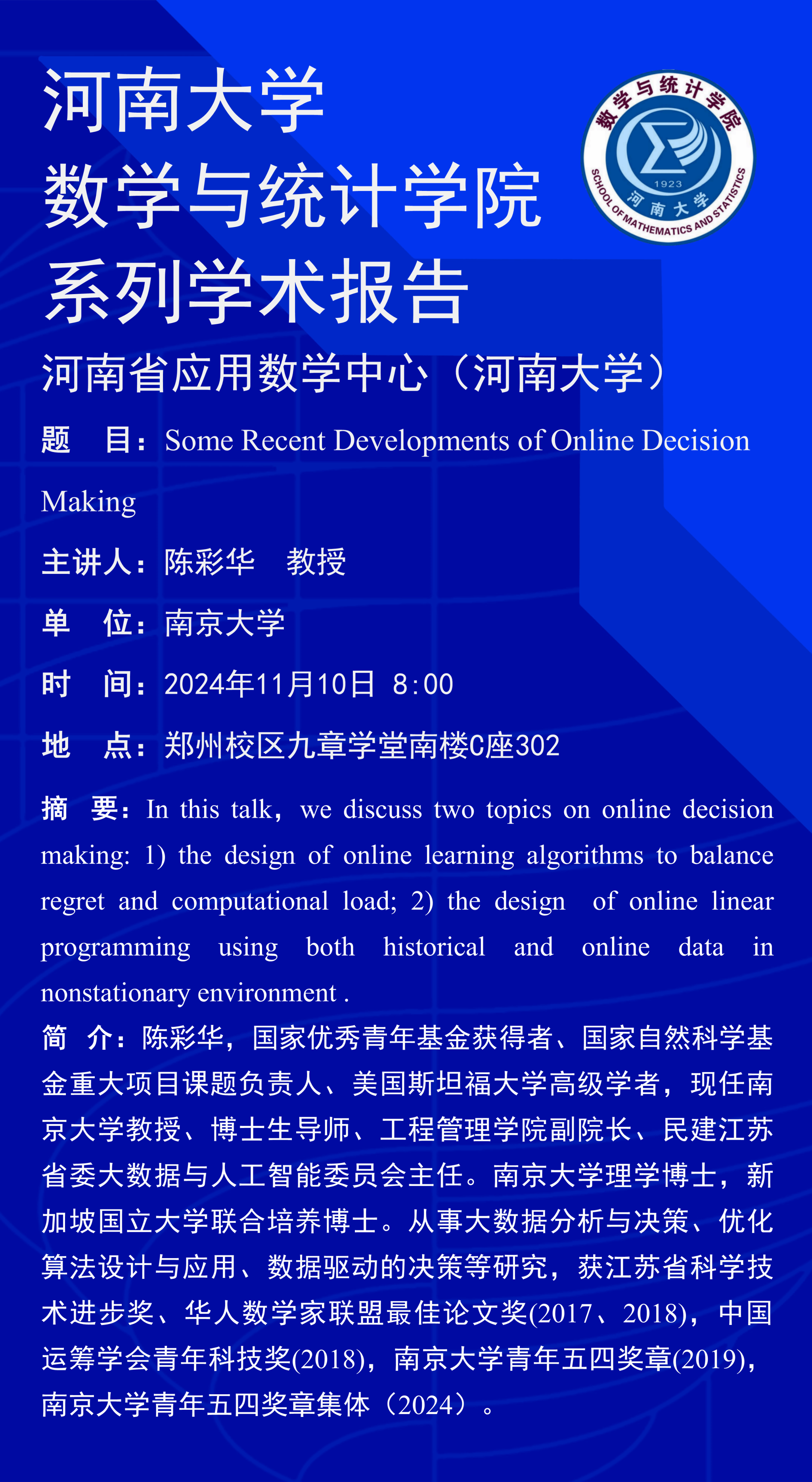 陈彩华:Some Recent Developments of Online Decision Making(时间:11月10日)