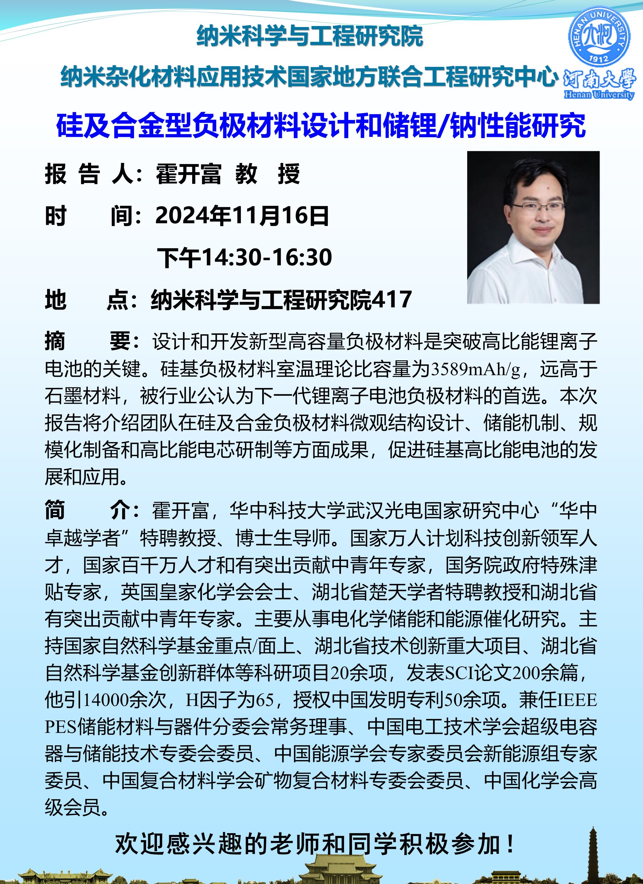 霍开富:硅及合金型负极材料设计和储锂/钠性能研究(时间:11月16日)