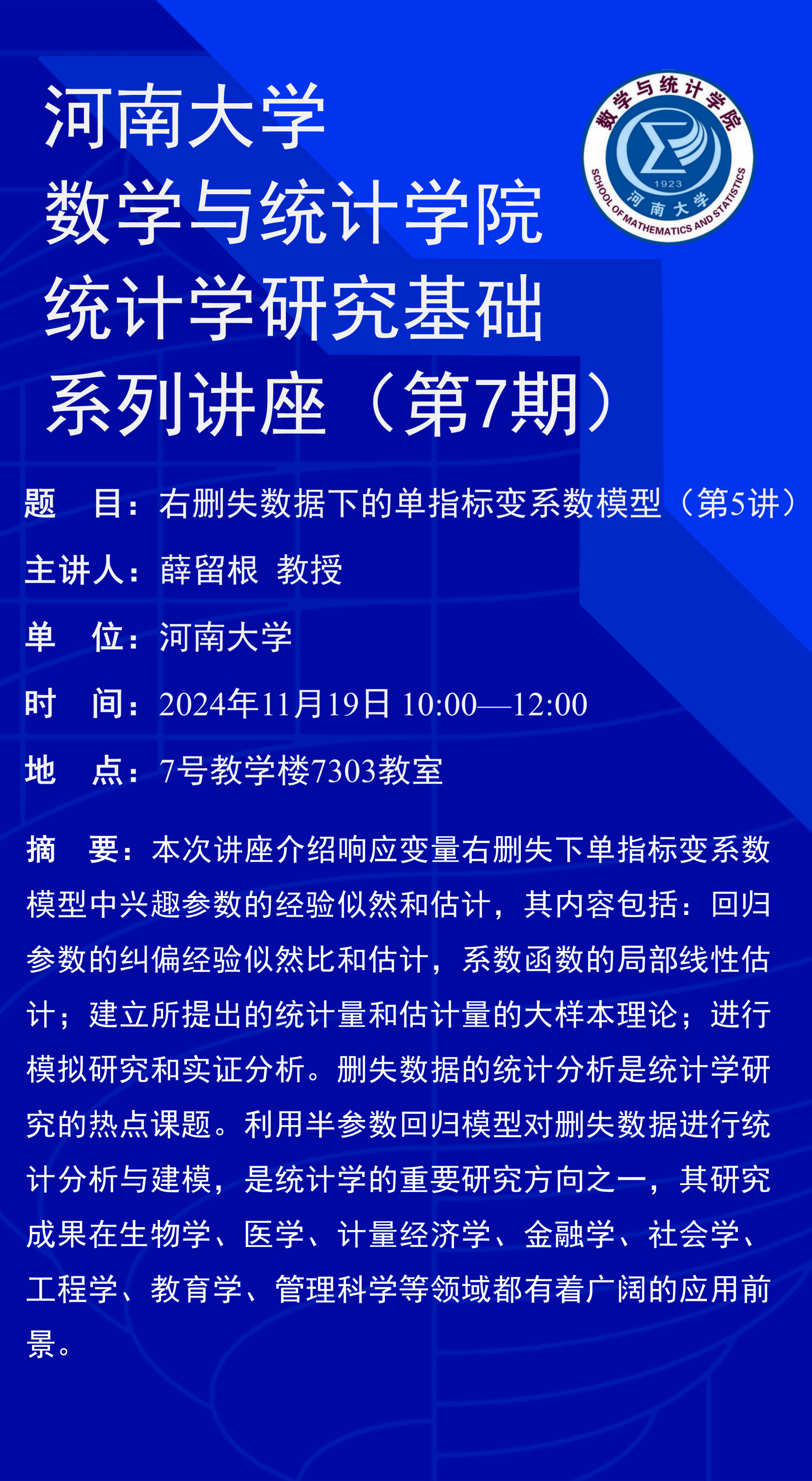 薛留根:右删失数据下的单指标变系数模型(第5讲)(时间:11月19日)