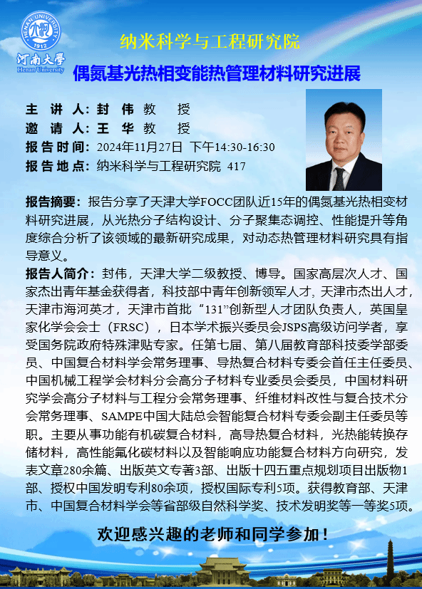 封伟:偶氮基光热相变能热管理材料研究进展(时间:11月27日)