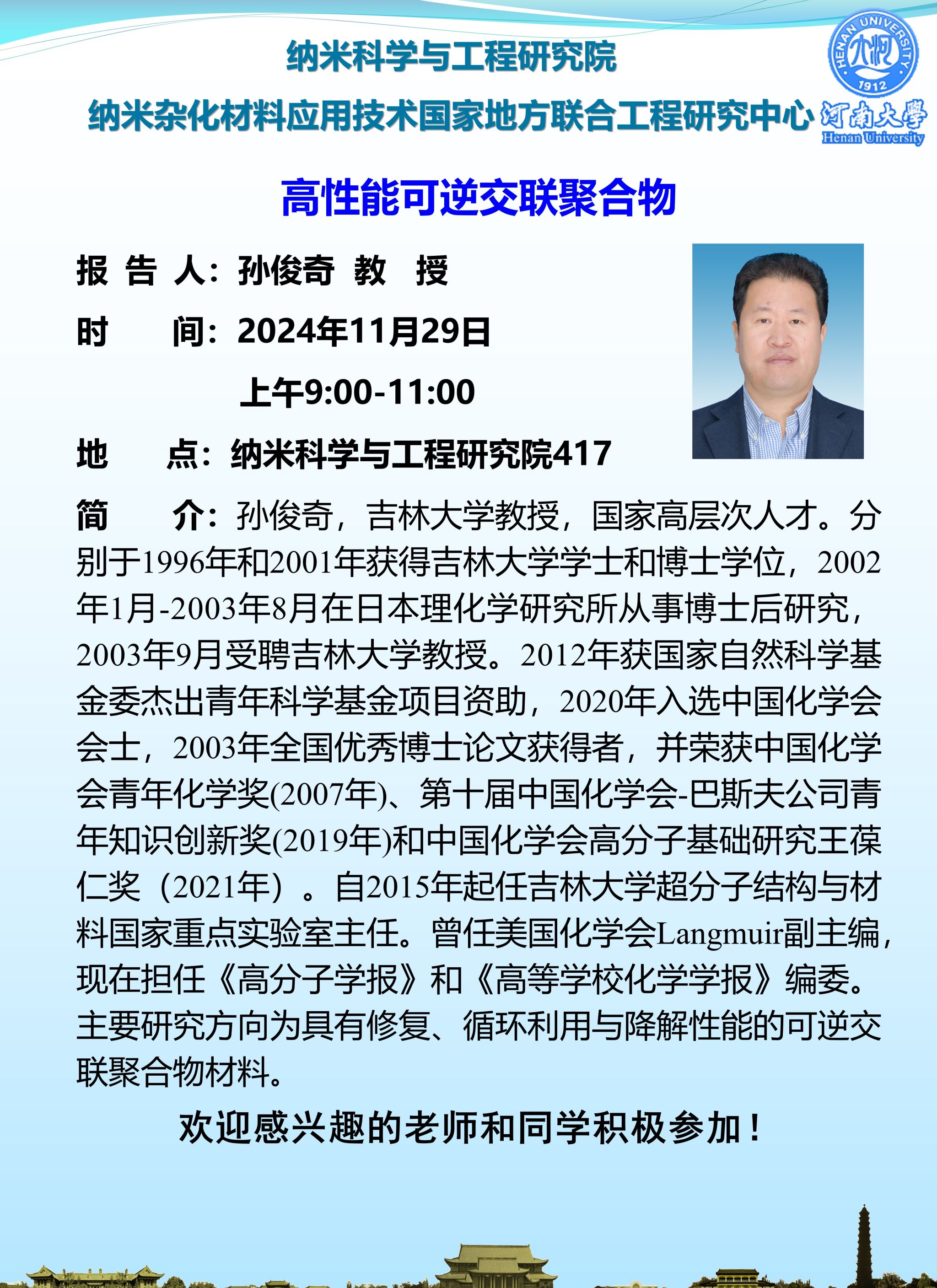 孙俊奇:高性能可逆交联聚合物(时间:11月29日)