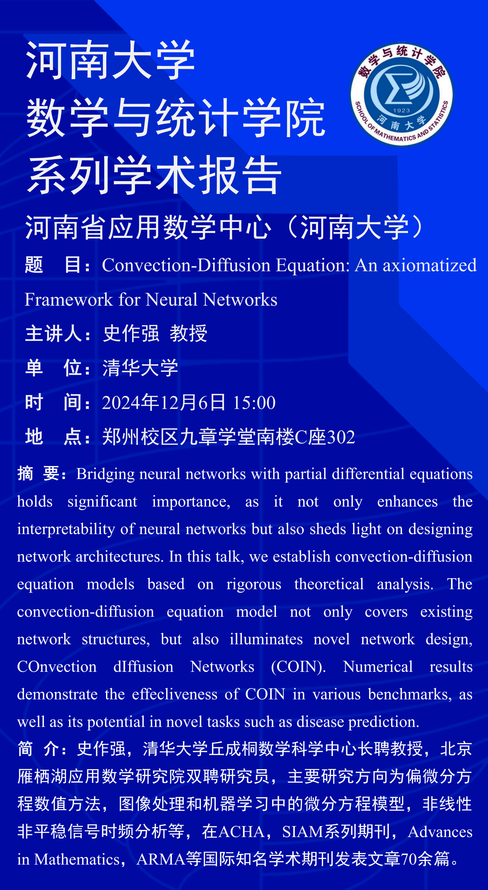 史作强:Convection-Diffusion Equation: An axiomatized Framework for Neural Networks(时间:12月6日)