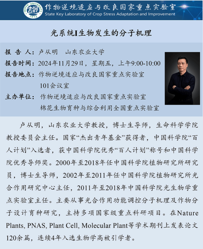 卢从明:光系统I生物发生的分子机理报告(时间:11月29日)