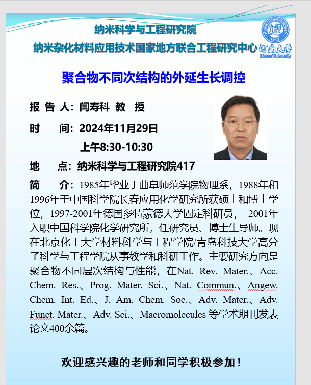 闫寿科:聚合物不同次结构的外延生长调控(时间:11月29日)