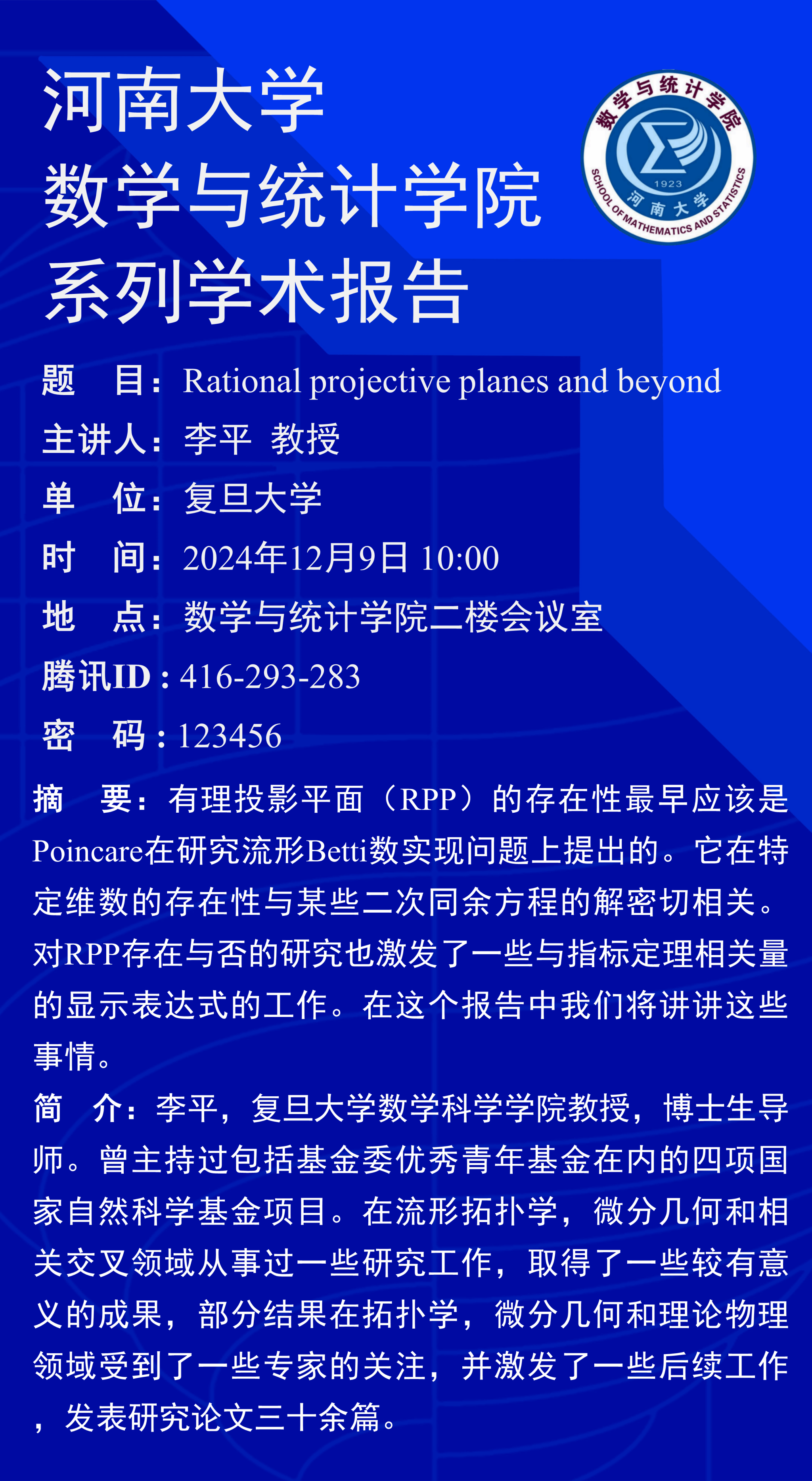 李平:Rational projective planes and beyond(时间:2024年12月9日)