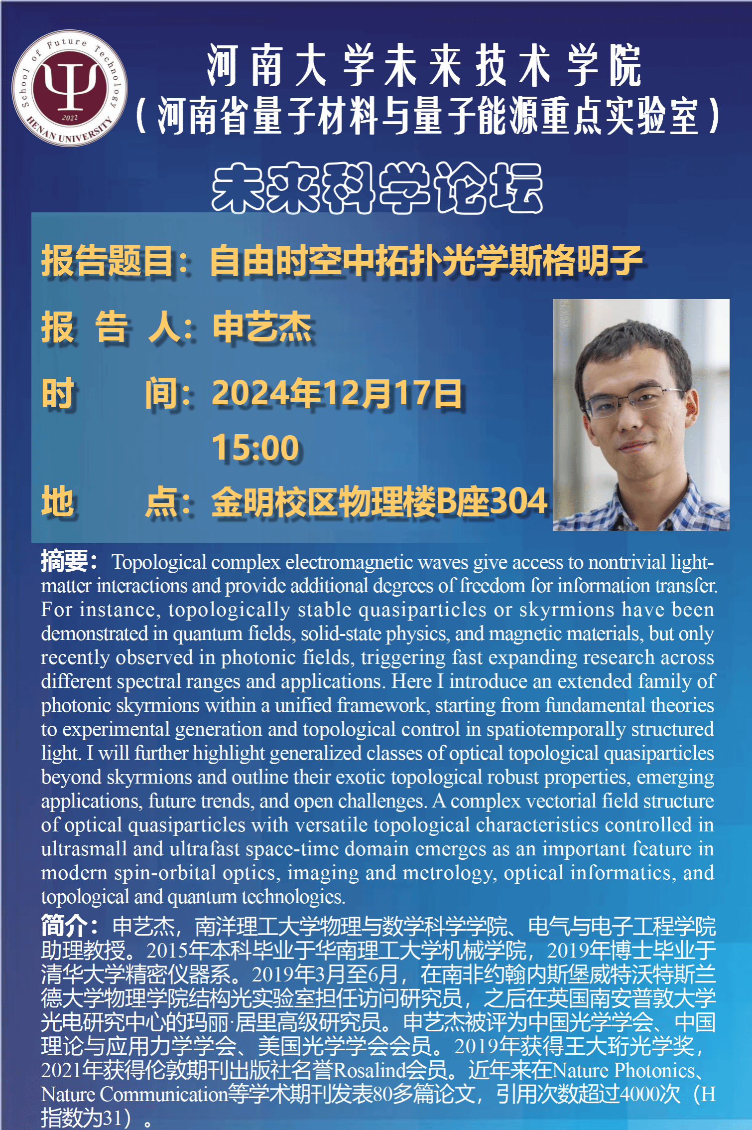 申艺杰:自由时空中拓扑光学斯格明子(时间:12月17日)