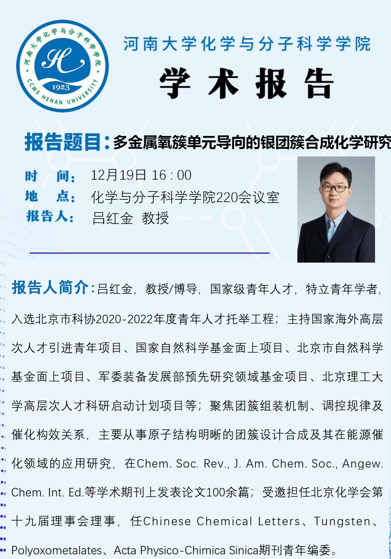 吕红金:多金属氧簇单元导向的银团簇合成化学研究(时间:12 月19日)