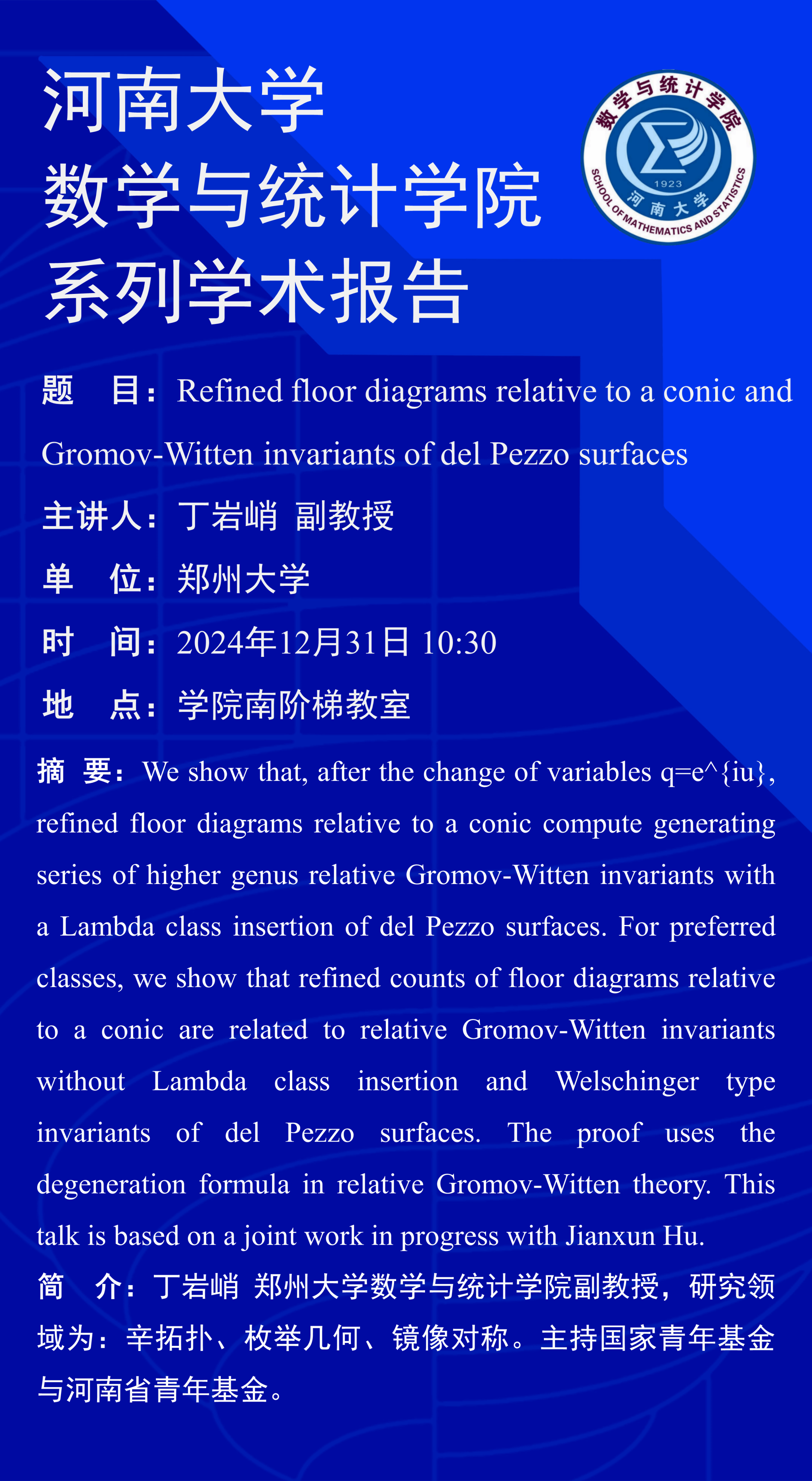 丁岩峭:Refined floor diagrams relative to a conic and Gromov-Witten invariants of del Pezzo surfaces(时间:12月31日)