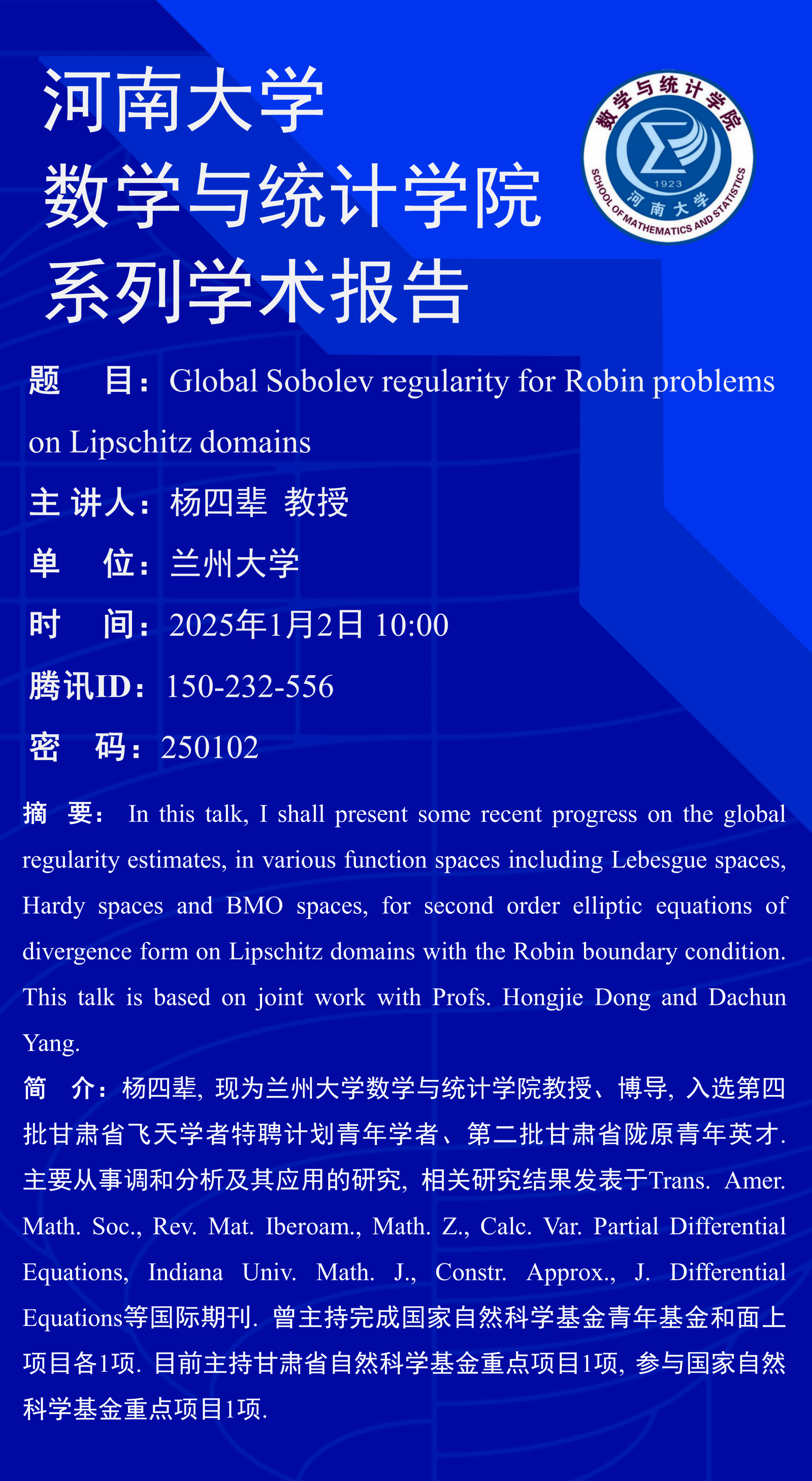 杨四辈:Global Sobolev regularity for Robin problems on Lipschitz domains(时间:1月2日)