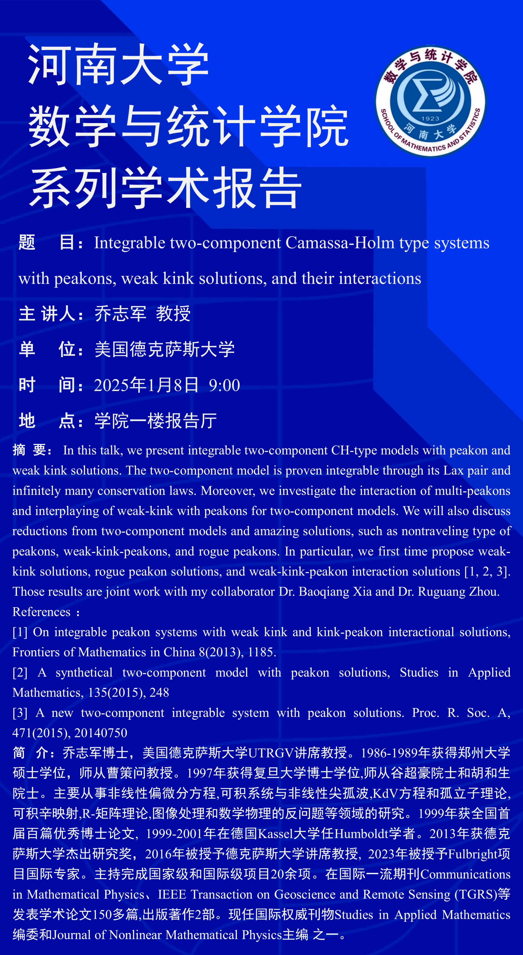 乔志军:Integrable two-component Camassa-Holm type systems with peakons, weak kink solutions, and their interactions (时间:1月8日)