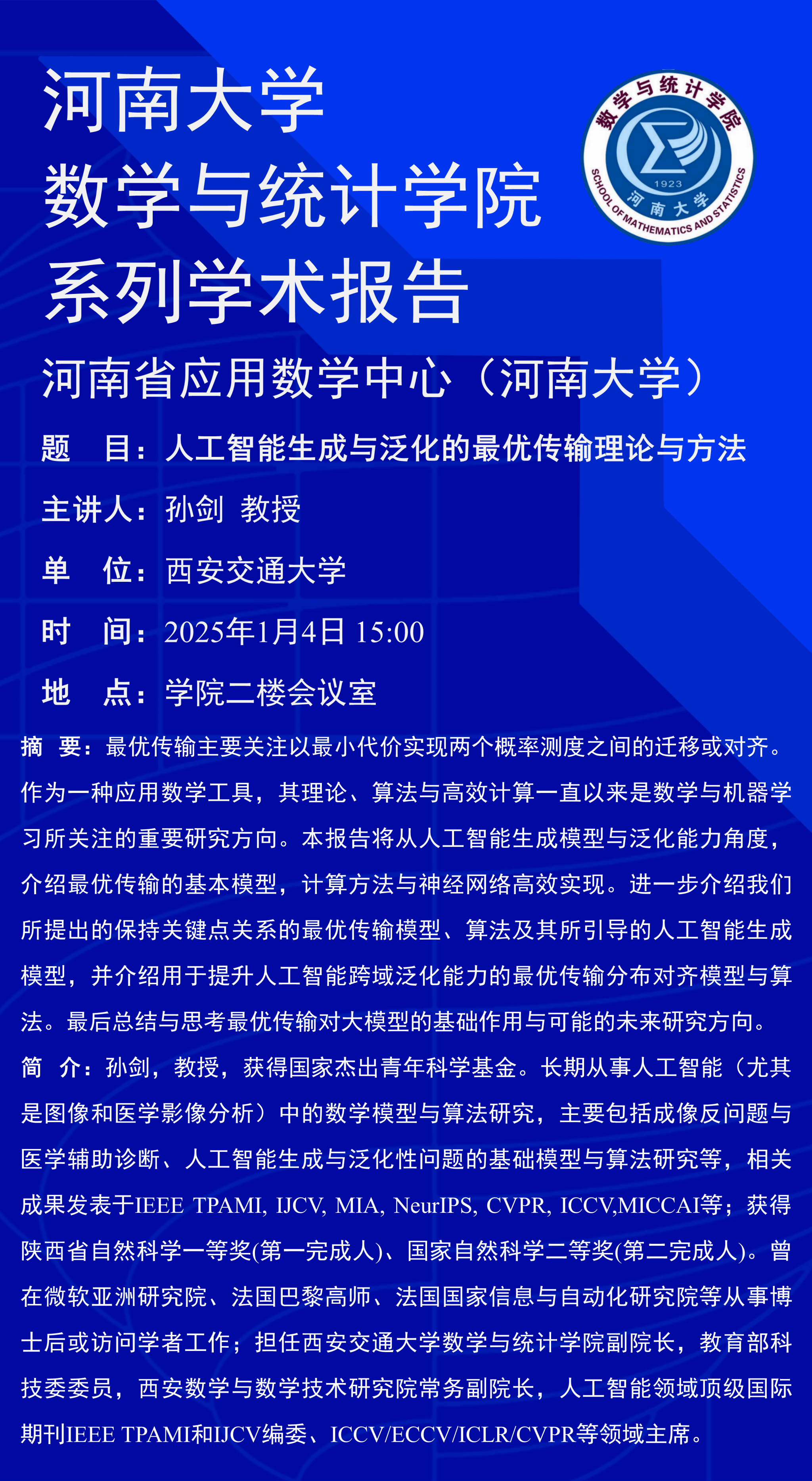 孙剑:人工智能生成与泛化的最优传输理论与方法 (时间:1月4日)