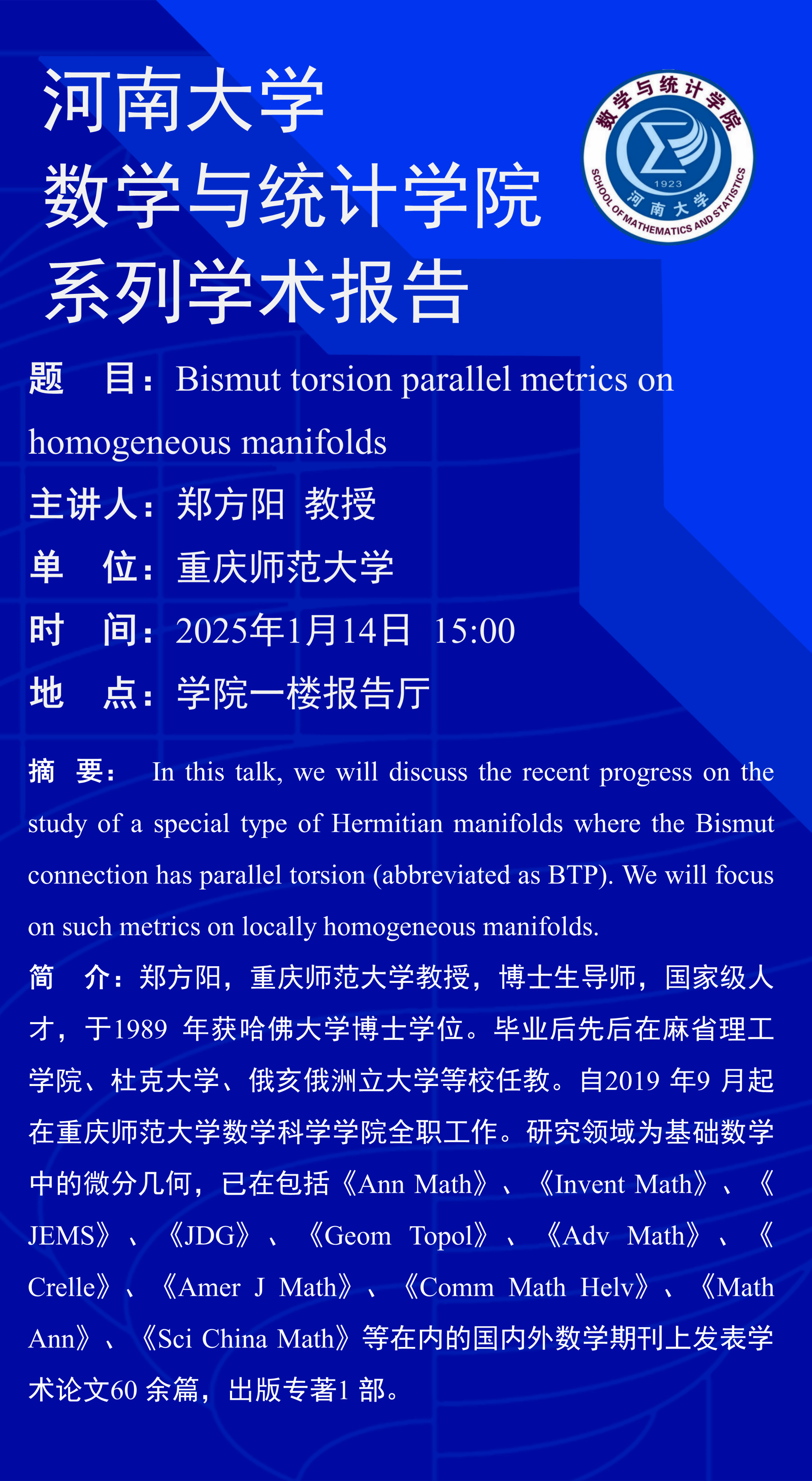 郑方阳:Bismut torsion parallel metrics on homogeneous manifolds(时间:1月14日)