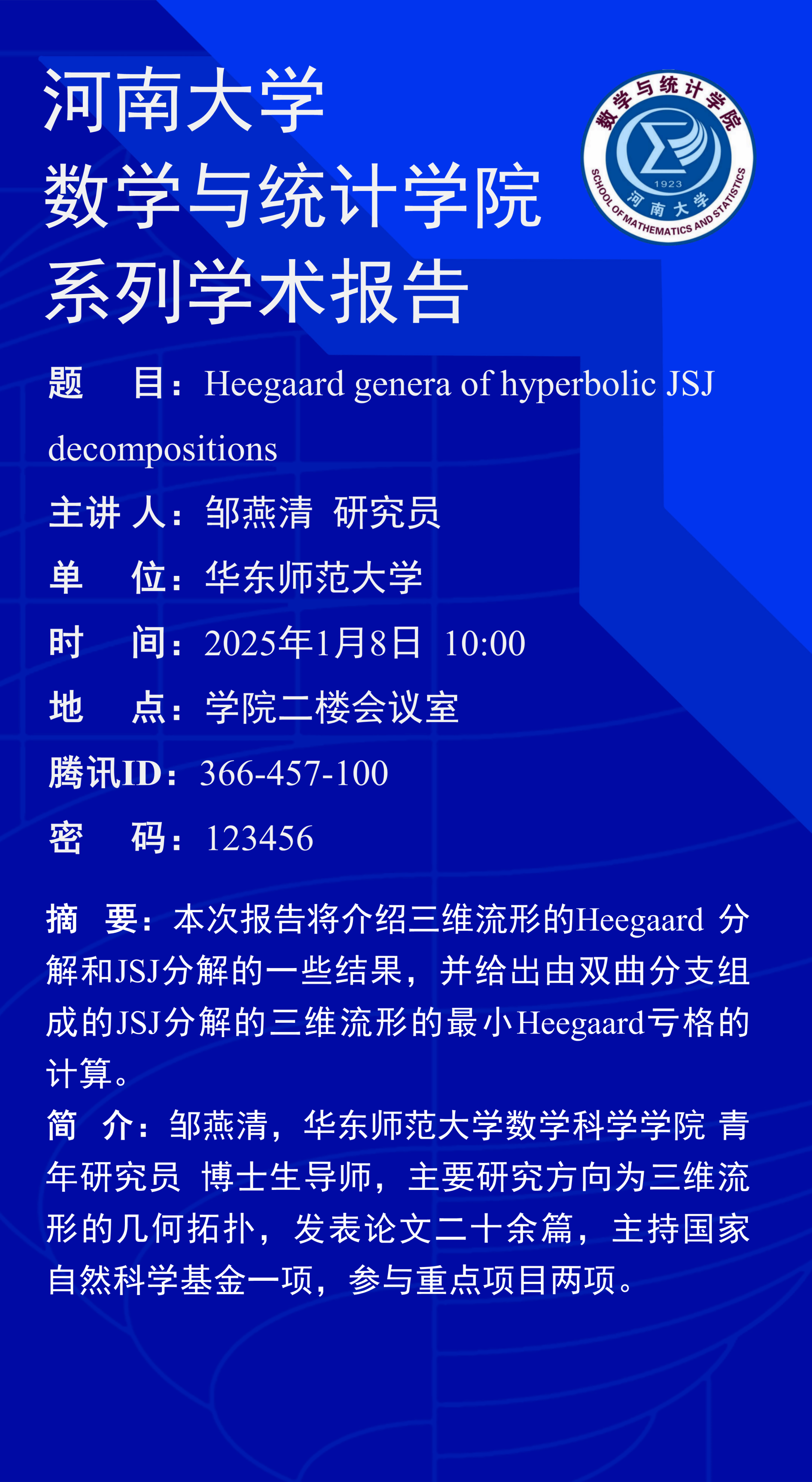 邹燕清:Heegaard genera of hyperbolic JSJ decompositions (时间:1月8日)