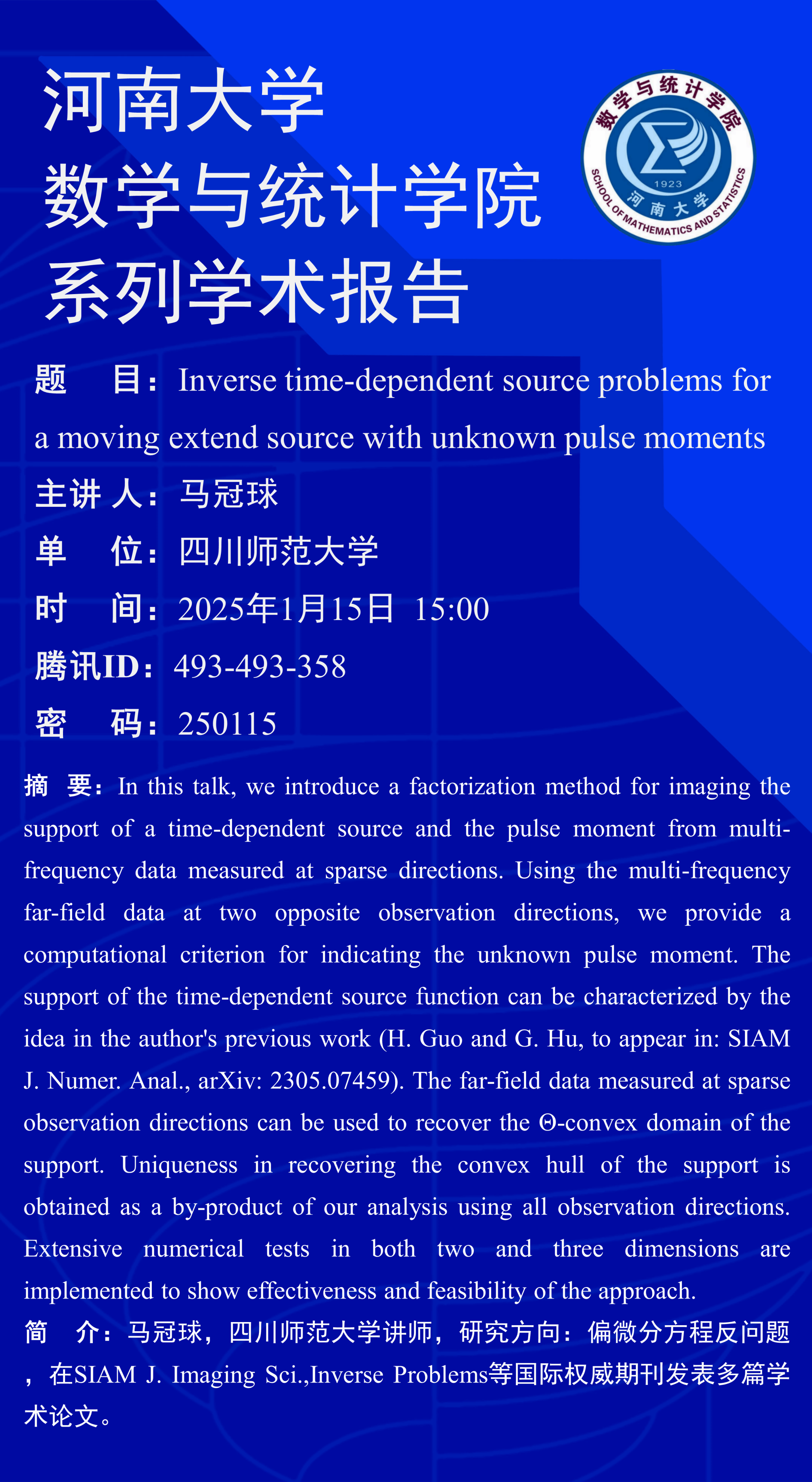 马冠球:Inverse time-dependent source problems for a moving extend source with unknown pulse moments(时间:1月15日)