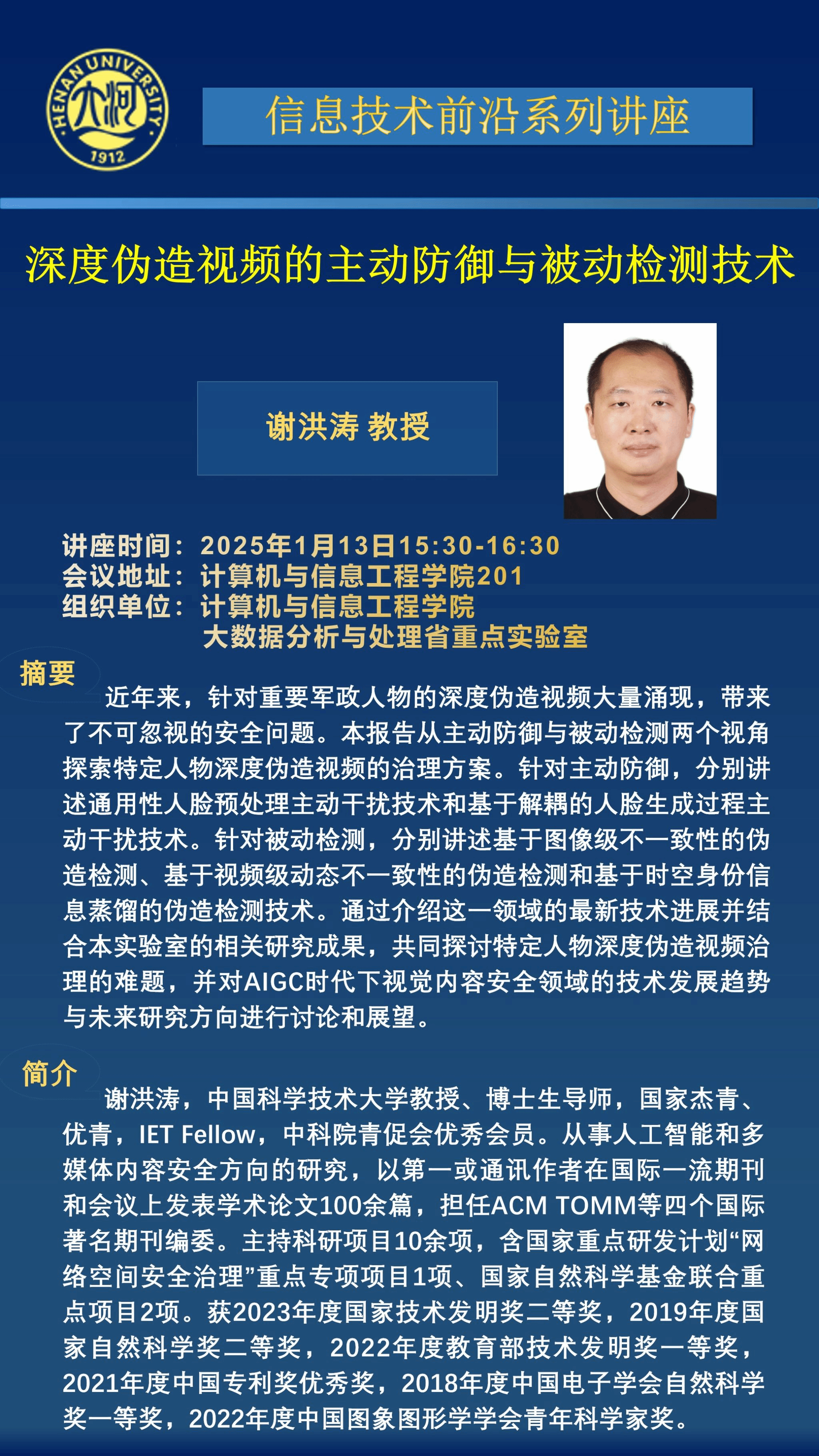 谢洪涛:深度伪造视频的主动防御与被动检测技术(时间:1月13日)