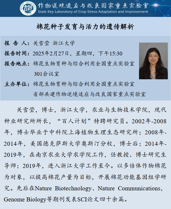 关雪莹:棉花种子发育与活力的遗传解析(时间:2月27日)