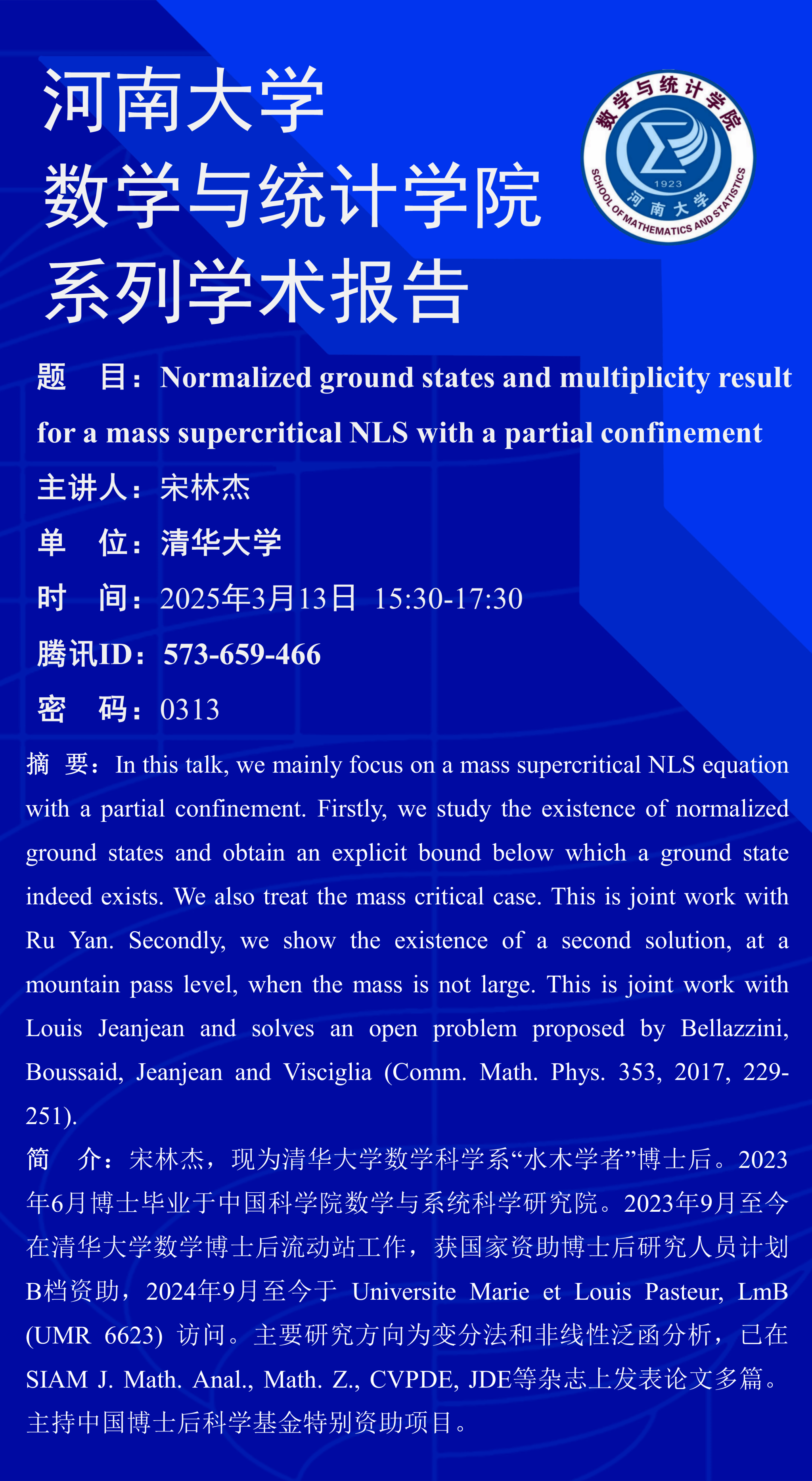 宋林杰:Normalized ground states and multiplicity result for a mass supercritical NLS with a partial confinement(时间:3月13日)