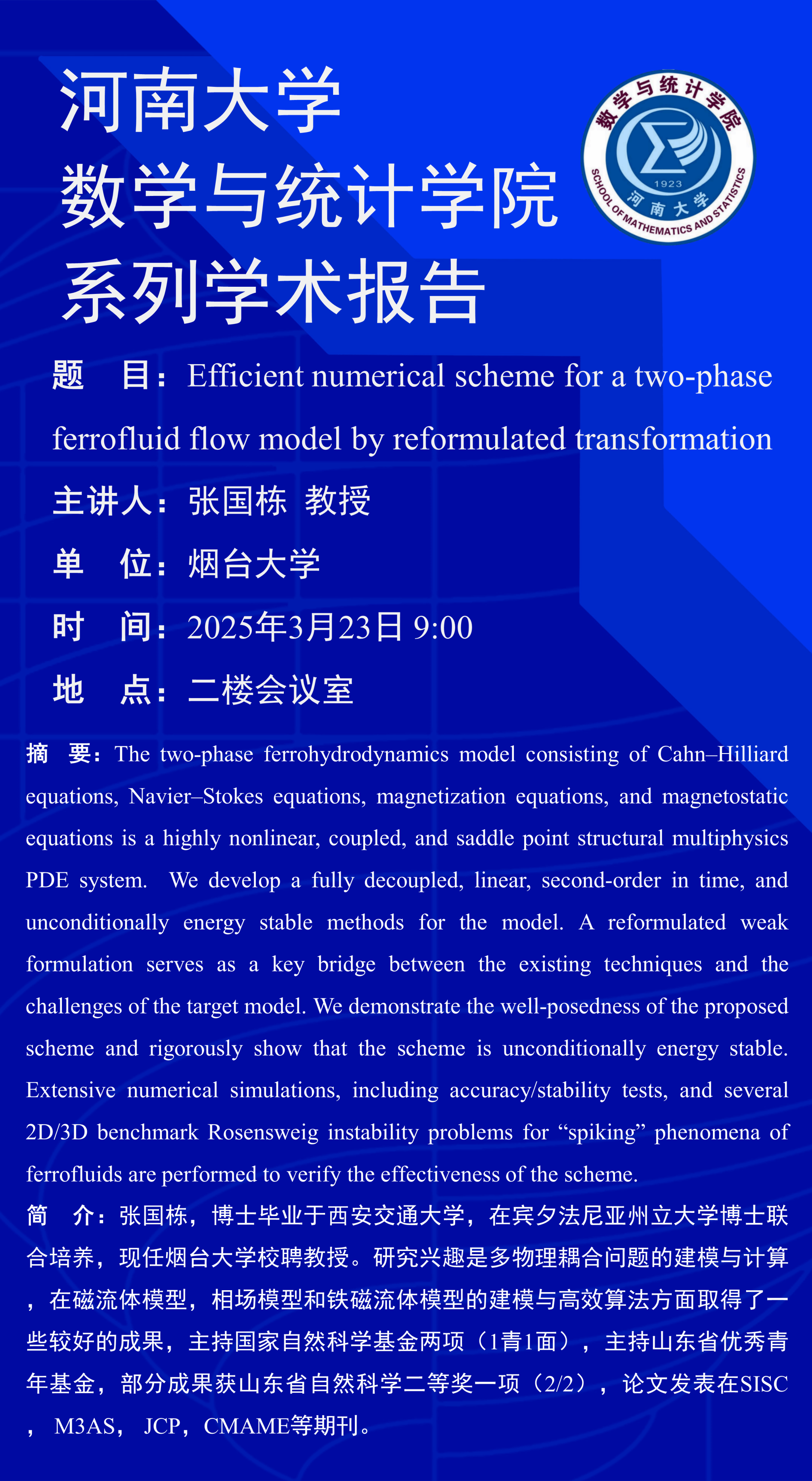 张国栋:Efficient numerical scheme for a two-phase ferrofluid flow model by reformulated transformation(时间:3月23日)