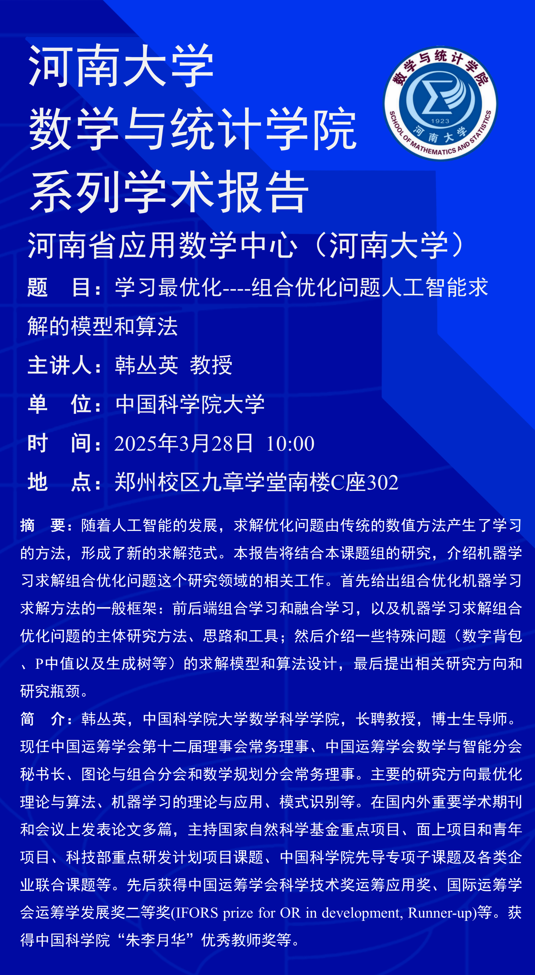 韩丛英:学习最优化----组合优化问题人工智能求解的模型和算法(时间:3月28日)