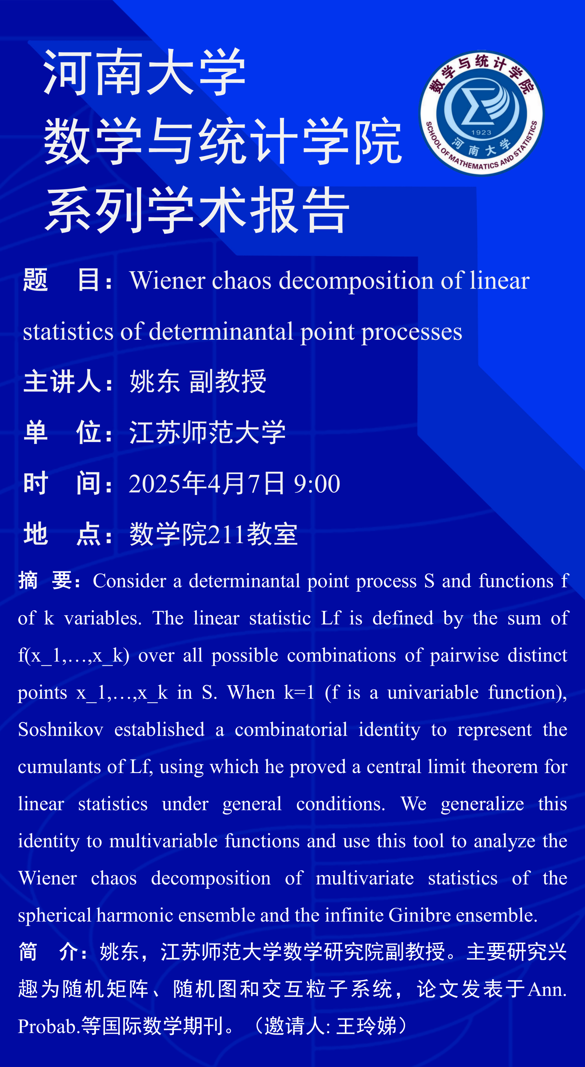 姚东:Wiener chaos decomposition of linear statistics of determinantal point processes(时间:4月7日)