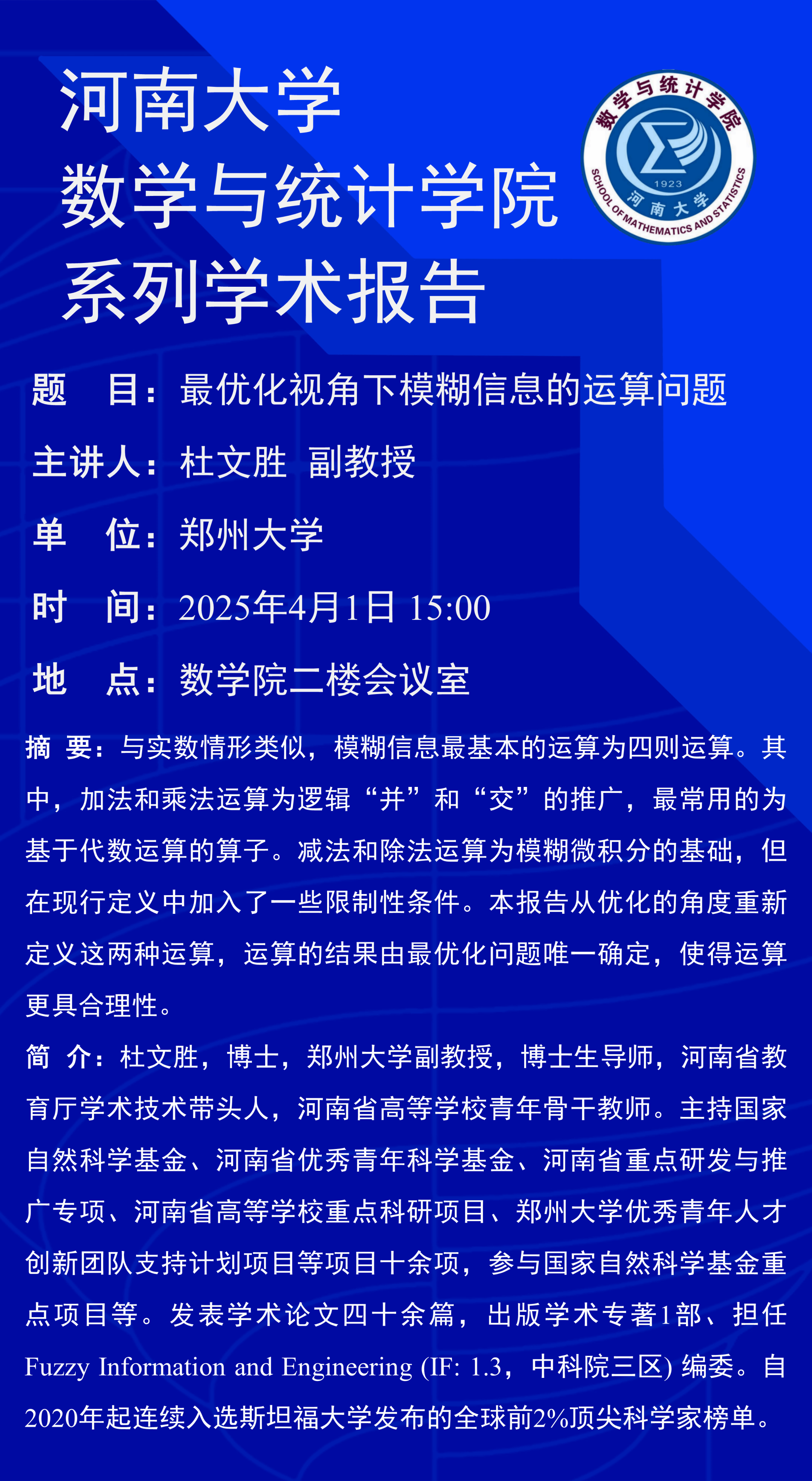 杜文胜:最优化视角下模糊信息的运算问题(时间:4月1日)