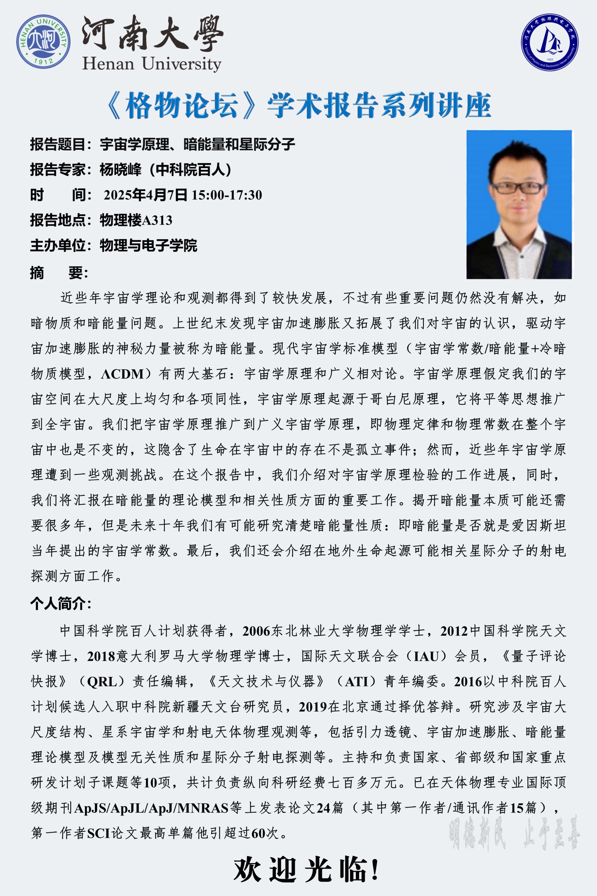 杨晓峰:宇宙学原理、暗能量和星际分子(时间:4月7日)