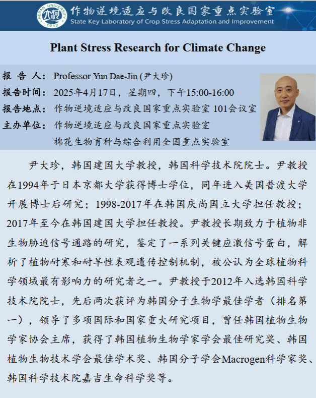 Yim Dae-Jin:Plant Stress Research for Climate Change(时间:4月17日)