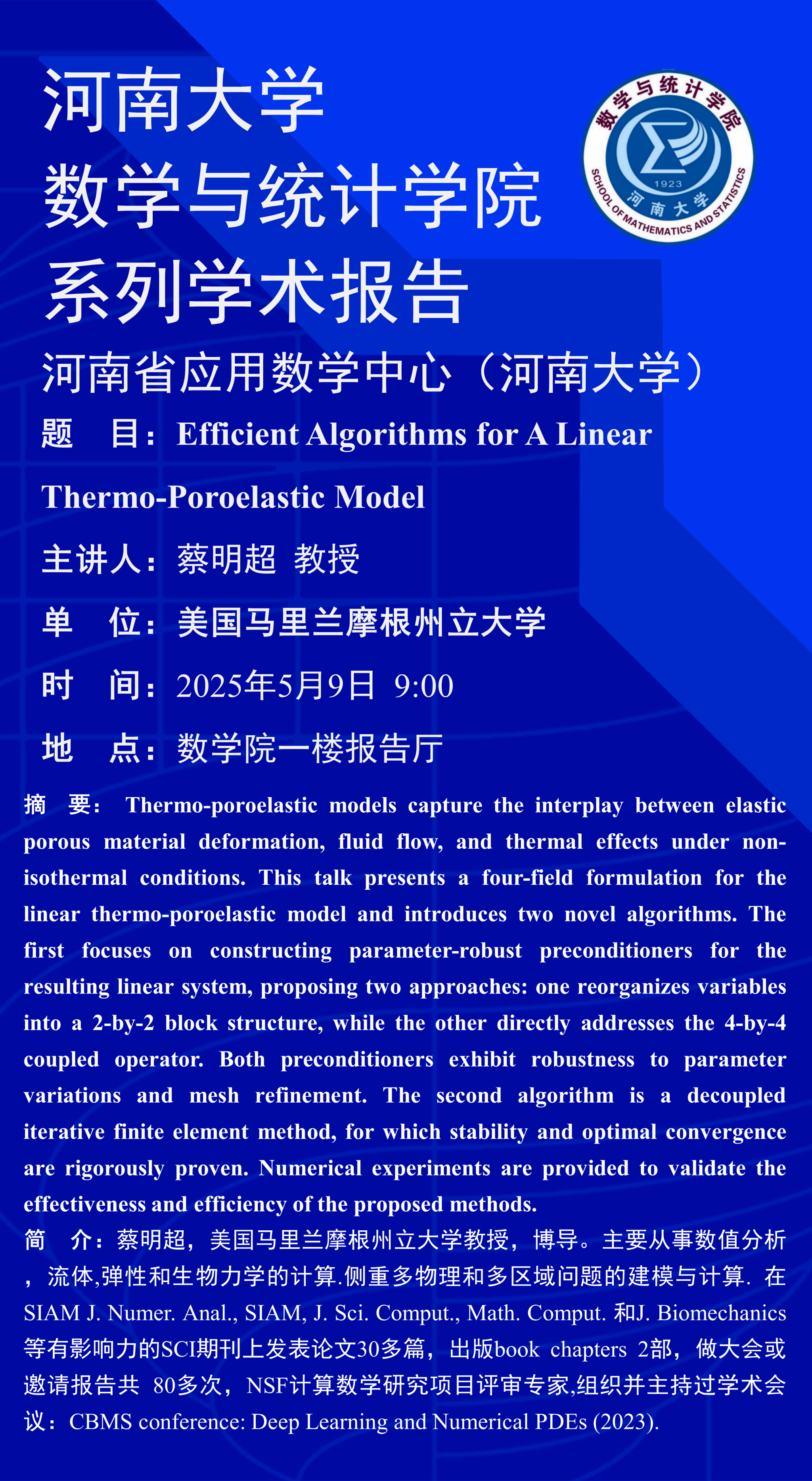 蔡明超:Efficient Algorithms for A Linear Thermo-Poroelastic Model(时间:5月9日)