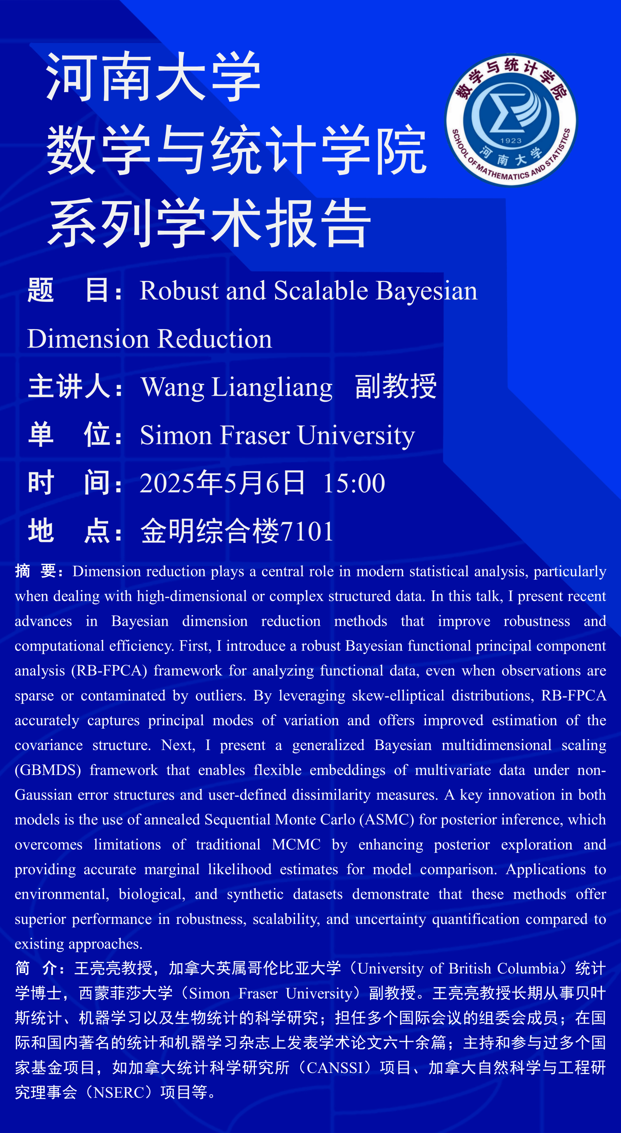 Wang Liangliang:Robust and Scalable Bayesian Dimension Reduction(时间:5月6日)