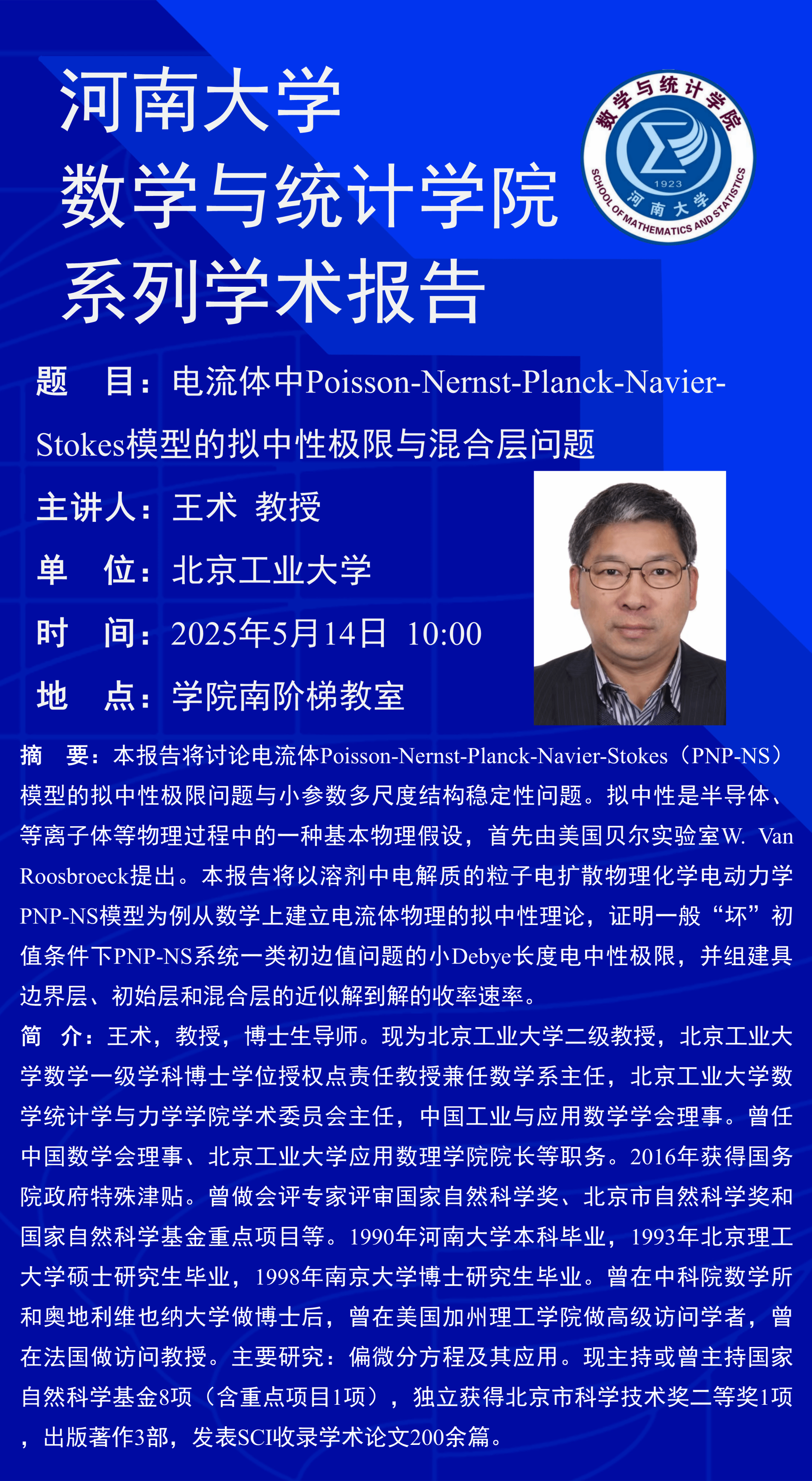 王术:电流体中Poisson-Nernst-Planck-Navier-Stokes模型的拟中性极限与混合层问题(时间:5月14日)