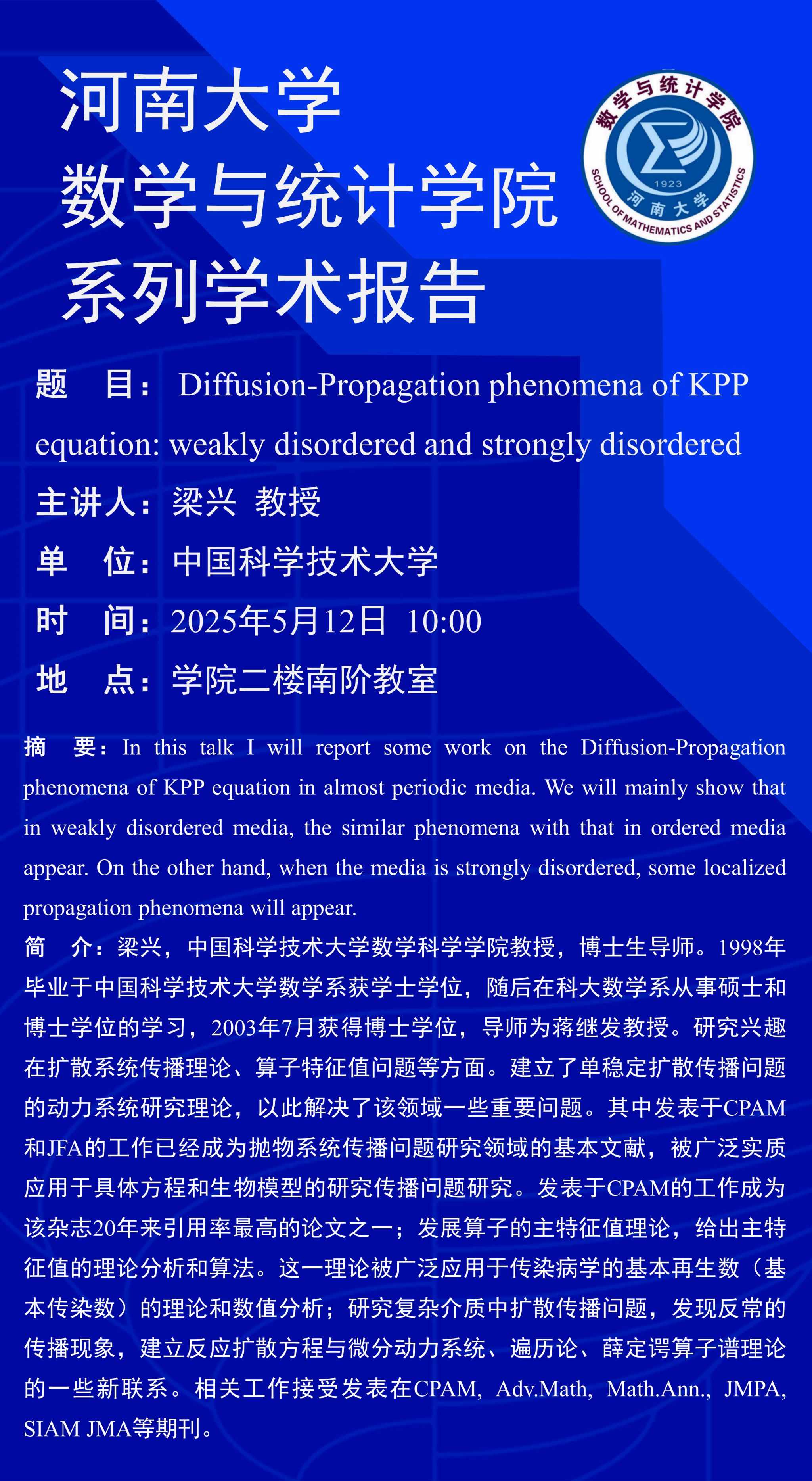 梁兴:Diffusion-Propagation phenomena of KPP equation: weakly disordered and strongly disordered(时间:5月12日)