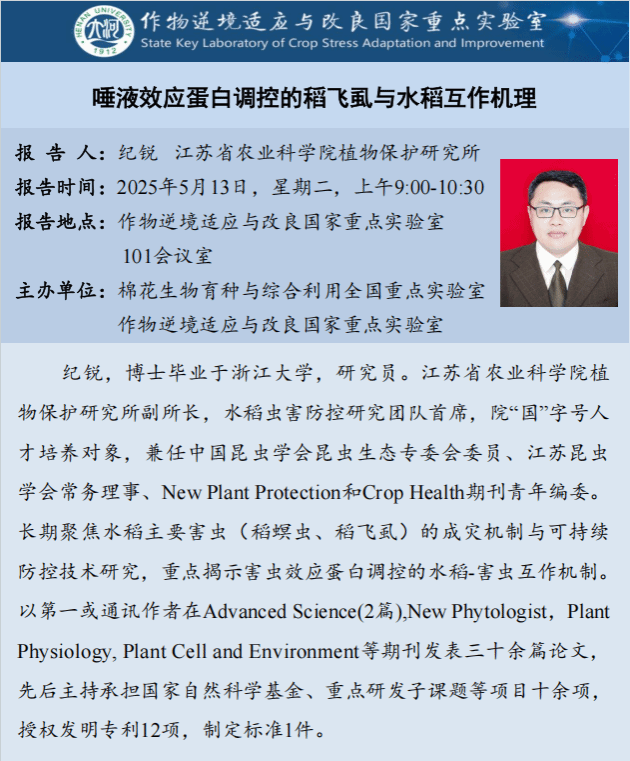 纪锐:唾液效应蛋自调控的稻飞虱与水稻互作机理(时间:5月13日)