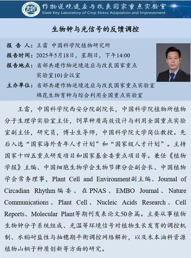 王雷:生物钟与光信号的反馈调控 (时间:5月18日)