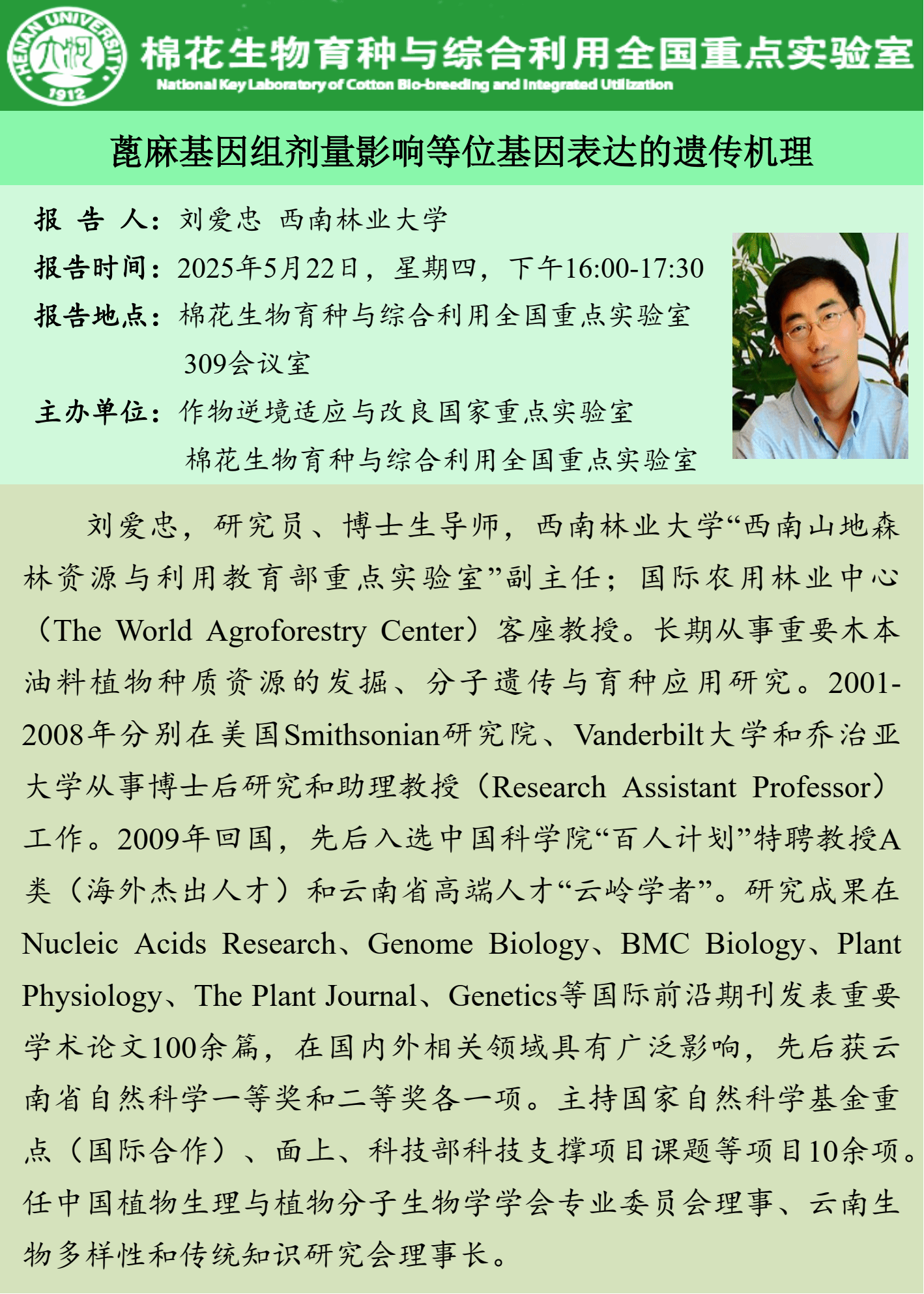 刘爱忠:蓖麻基因组剂量影响等位基因表达的遗传机理(时间:5月22日)